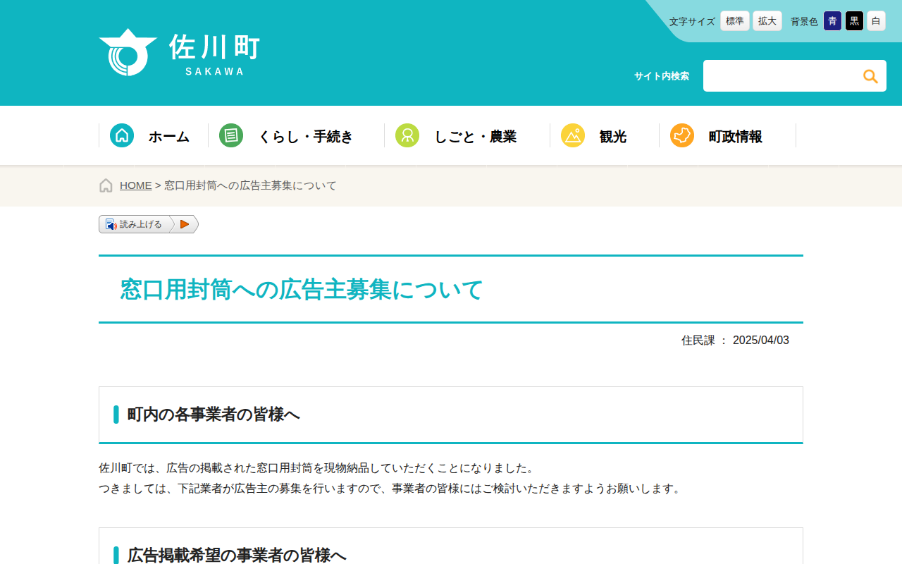 窓口用封筒への広告主募集について | 佐川町役場 - 保存されたスクリーンショット
