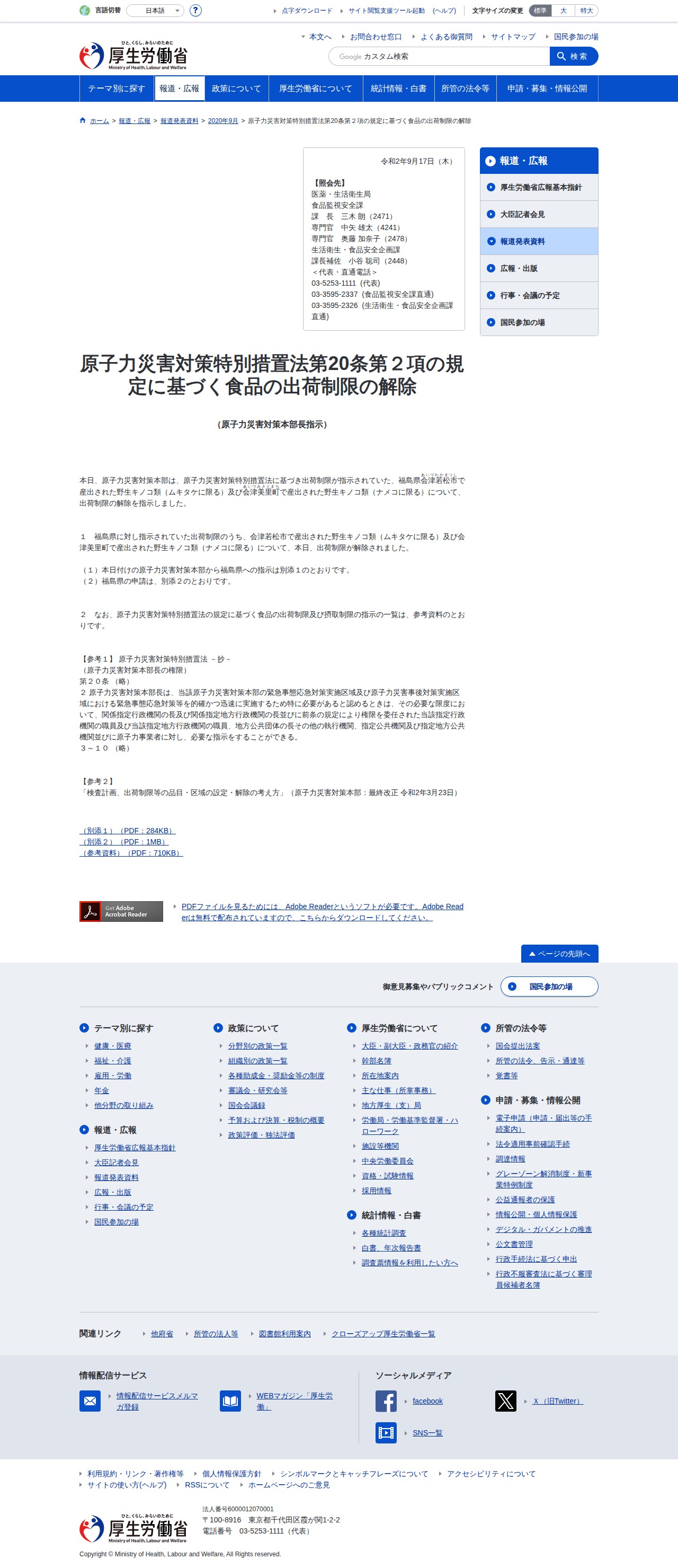 原子力災害対策特別措置法第20条第2項の規定に基づく食品の出荷制限の解除
