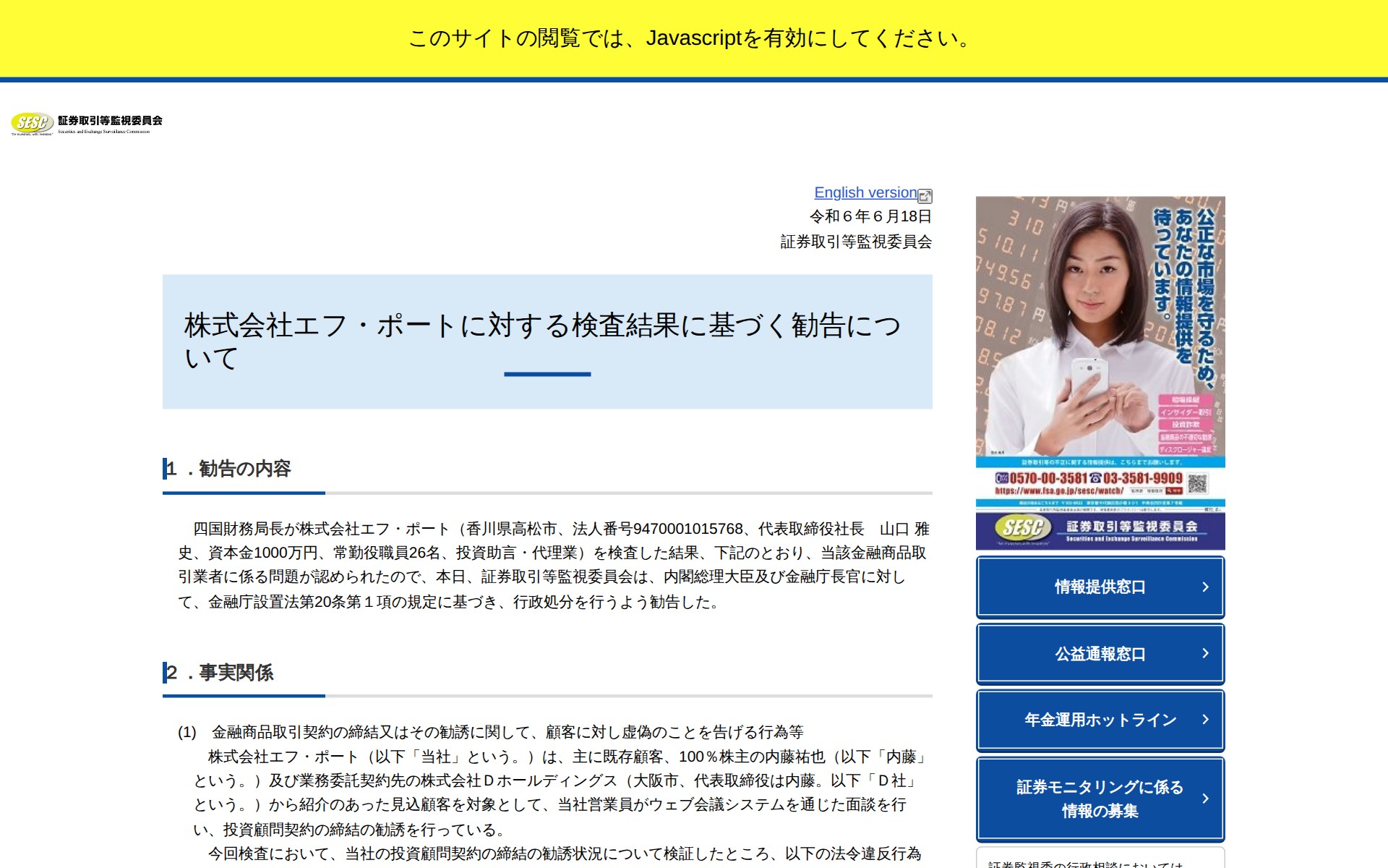 https://www.fsa.go.jp/sesc/news/c_2024/2024/20240618-1.html2026年4月5日 21:30 JST•アーカイブページ・viewer・ダウンロードは、この保存版を基準に表示されます。