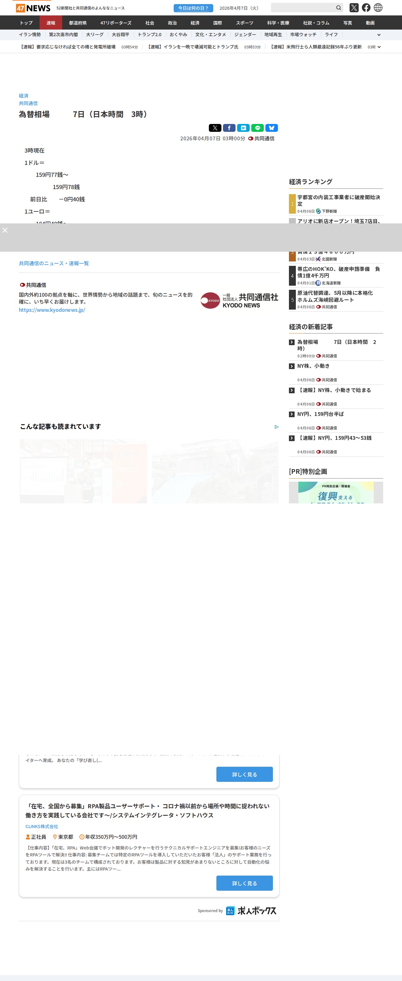 このページは、2026年4月7日日本時間午前3時時点の為替相場を報じた共同通信の記事です。1ドルは159円77銭~159円78銭で、前日比0円40銭の円高となっています。1ユーロは184円40銭~184円41銭で、前日比0円10銭の円高です。ページには経済ニュースの速報や求人情報も掲載されています。