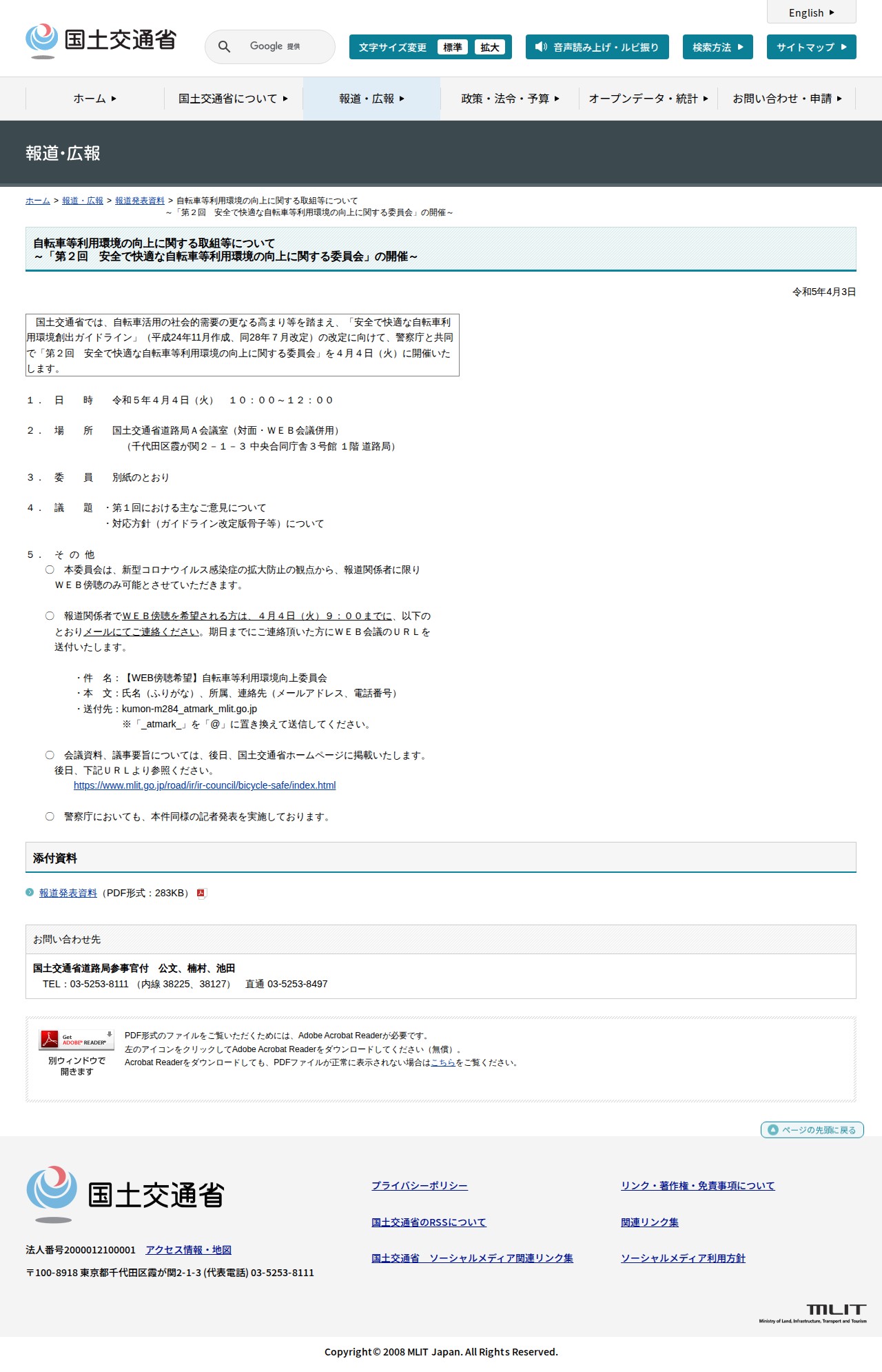 報道発表資料:自転車等利用環境の向上に関する取組等について<br>~「第2回 安全で快適な自転車等利用環境の向上に関する委員会」の開催~ - 国土交通省 - 保存されたスクリーンショット