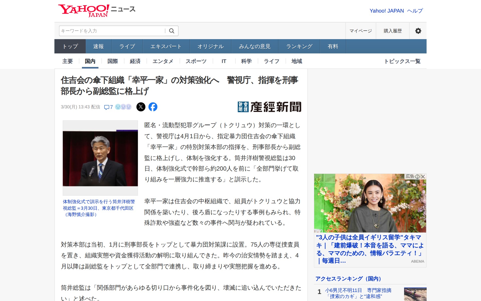このページは、警視庁が指定暴力団住吉会の傘下組織「幸平一家」への対策を強化することを報じている。4月1日から、特別対策本部の指揮を刑事部長から副総監に格上げする。幸平一家は住吉会の中枢組織で、匿名・流動型犯罪グループ(トクリュウ)と協力関係を築き、特殊詐欺や強盗などの事件に関与が疑われている。対策本部は1月に設置され、75人の専従捜査員が組織実態と資金獲得活動の解明に当たっている。筒井警視総監は全部門連携による強い推進を指示した。