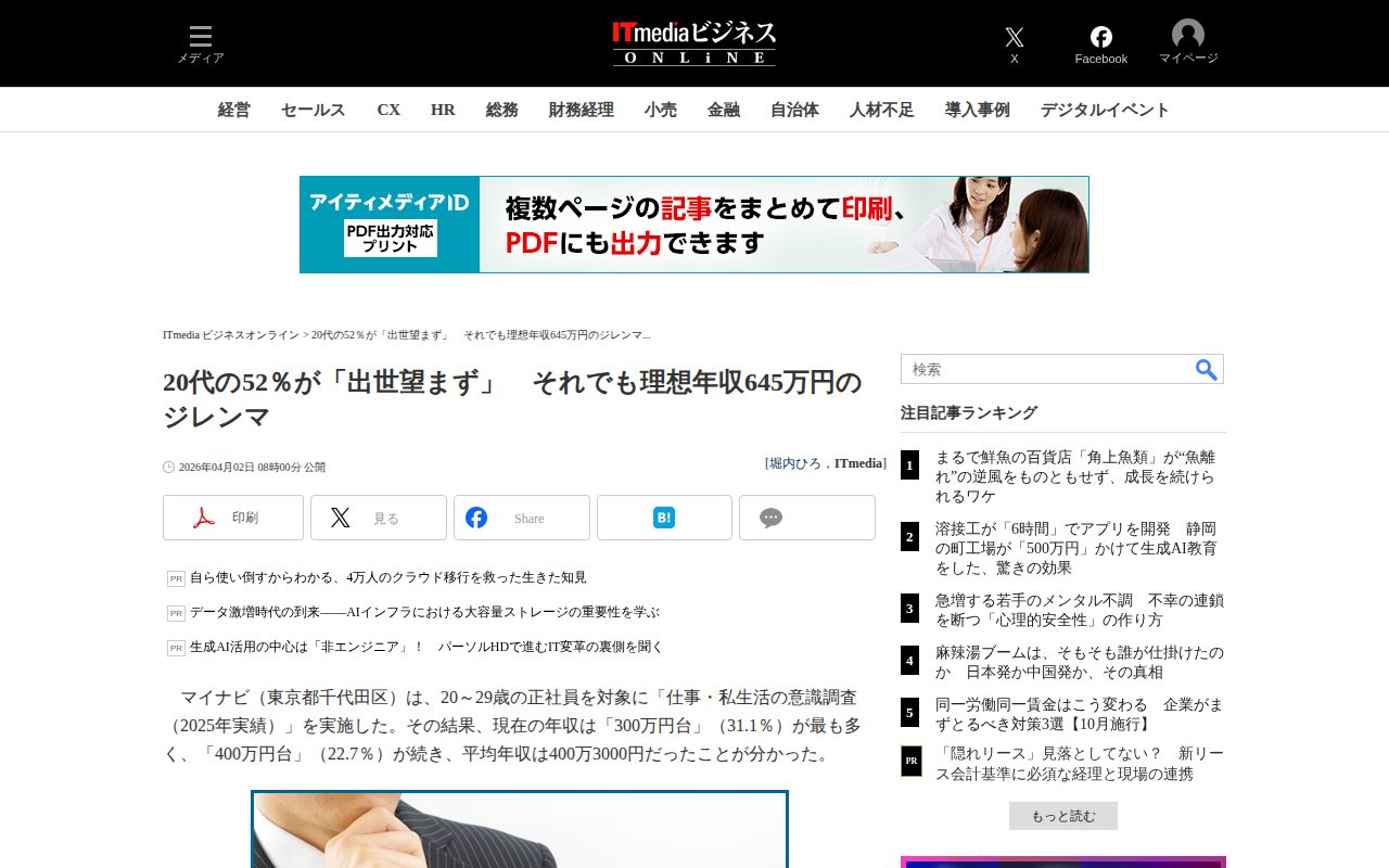 20代の52%が「出世望まず」 それでも理想年収645万円のジレンマ(1/2 ページ) - ITmedia ビジネスオンライン - 保存されたスクリーンショット
