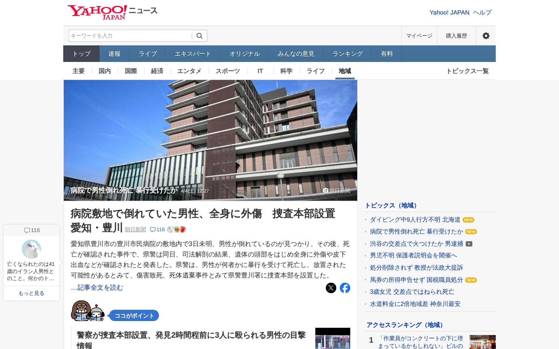 このページは、愛知県豊川市の豊川市民病院敷地内で発見された41歳のイラン国籍の男性が死亡した事件を報じています。司法解剖の結果、遺体の頭部を含む全身に外傷や皮下出血が確認されました。県警は男性が何者かに暴行を受けて死亡し、放置された可能性があるとみて、傷害致死・死体遺棄事件として捜査本部を設置しました。発見の2時間前に約13km離れた東名パーキングエリアで、男性が複数人に鉄パイプで殴られている目撃情報もあります。