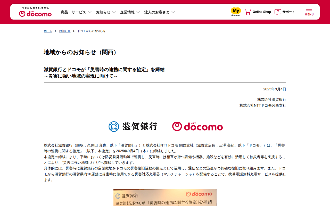 地域からのお知らせ(関西) : 滋賀銀行とドコモが「災害時の連携に関する協定」を締結~災害に強い地域の実現に向けて~ | お知らせ | NTTドコモ