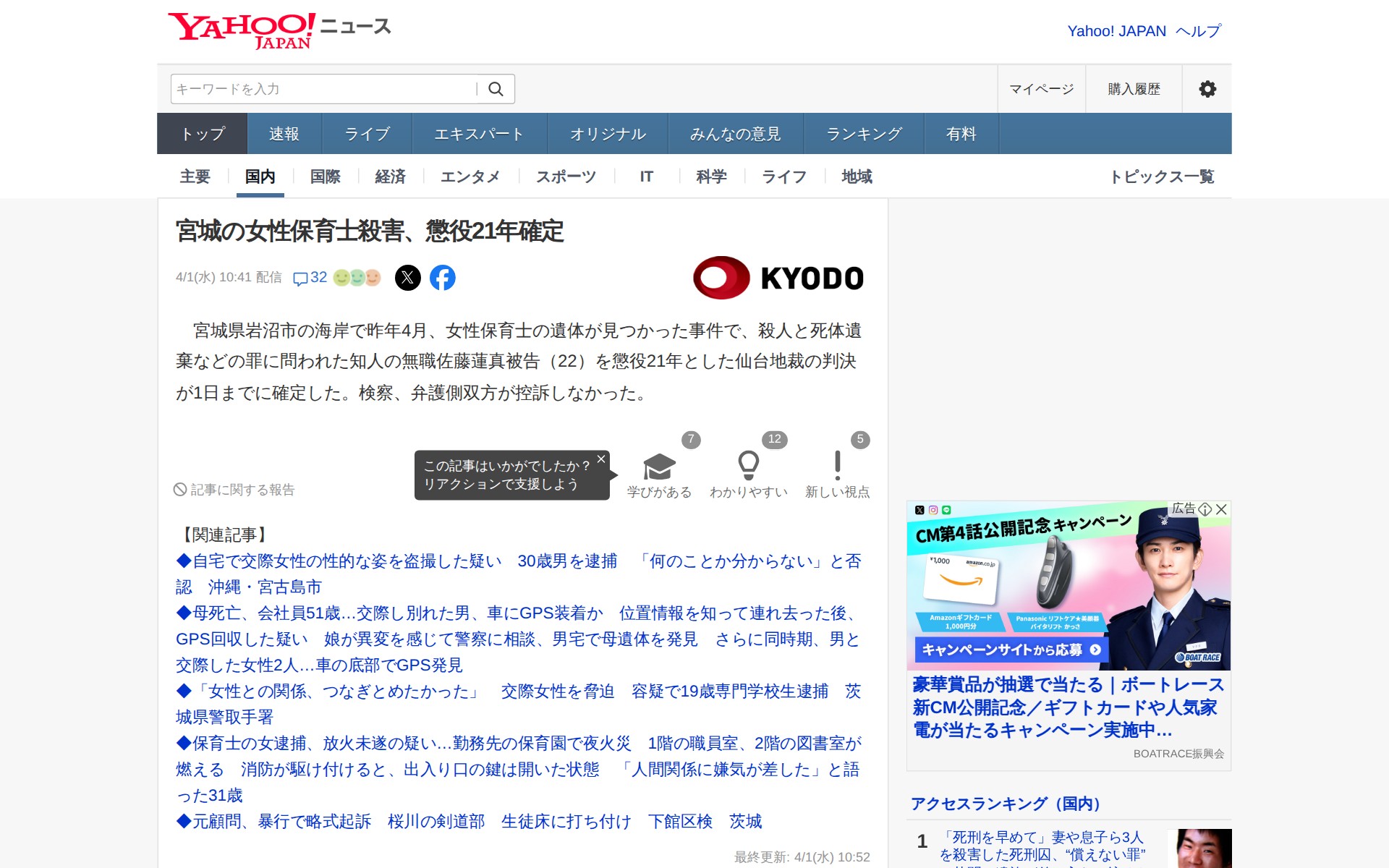 宮城の女性保育士殺害、懲役21年確定(共同通信) - Yahoo!ニュース