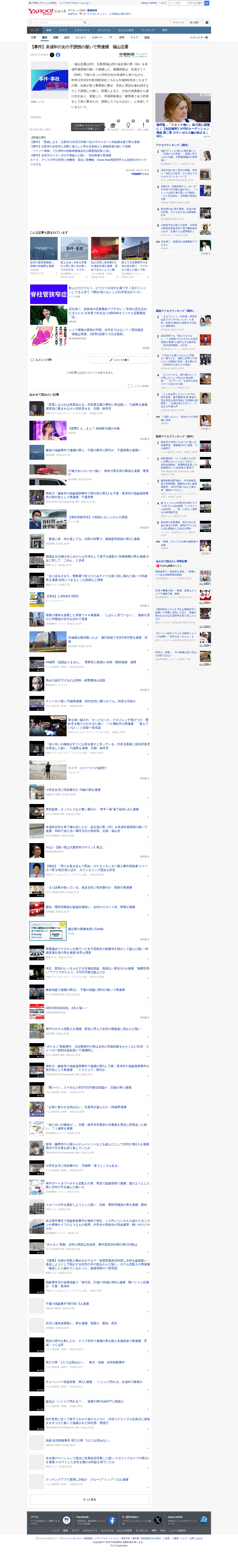 このページは、広島県福山市の54歳会社員が未成年者誘拐の疑いで逮捕されたニュースを報じています。容疑者はSNSで知り合った10代少女が未成年と知りながら、昨年12月4日に自身の乗用車に乗せて市内を連れ回したとされています。少女の保護者からの届け出により事件が発覚しました。容疑者は「会う約束をして車に乗せたが、誘拐するつもりはなかった」と供述しているとのことです。