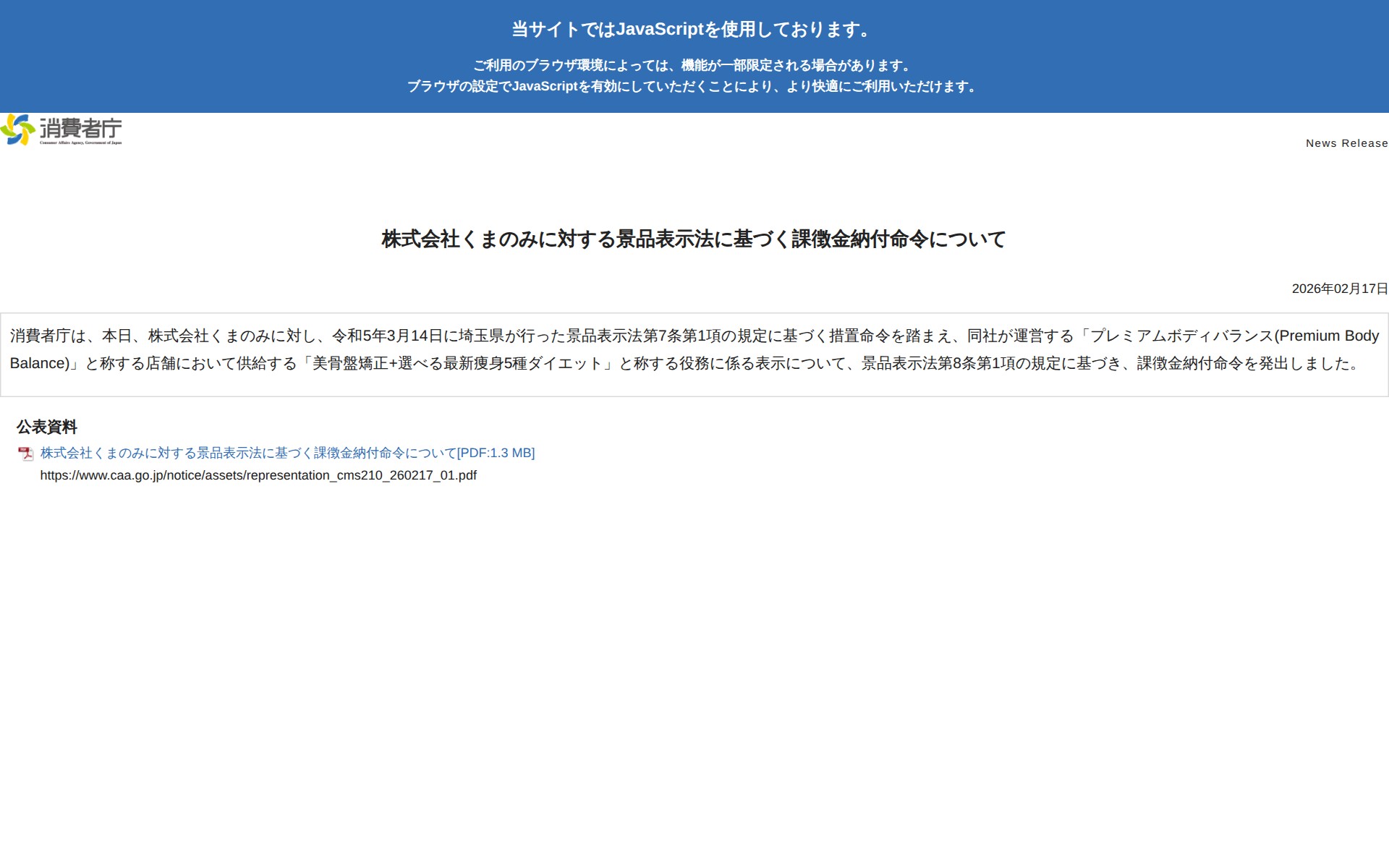 このページは、消費者庁が株式会社くまのみに対して発出した景品表示法に基づく課徴金納付命令について公表するものです。同社が運営する「プレミアムボディバランス」という店舗で提供する「美骨盤矯正+選べる最新痩身5種ダイエット」という役務の表示が景品表示法に違反していたため、2026年2月17日に課徴金納付命令が発出されました。この命令は、埼玉県が2023年3月に行った措置命令を踏まえたものです。