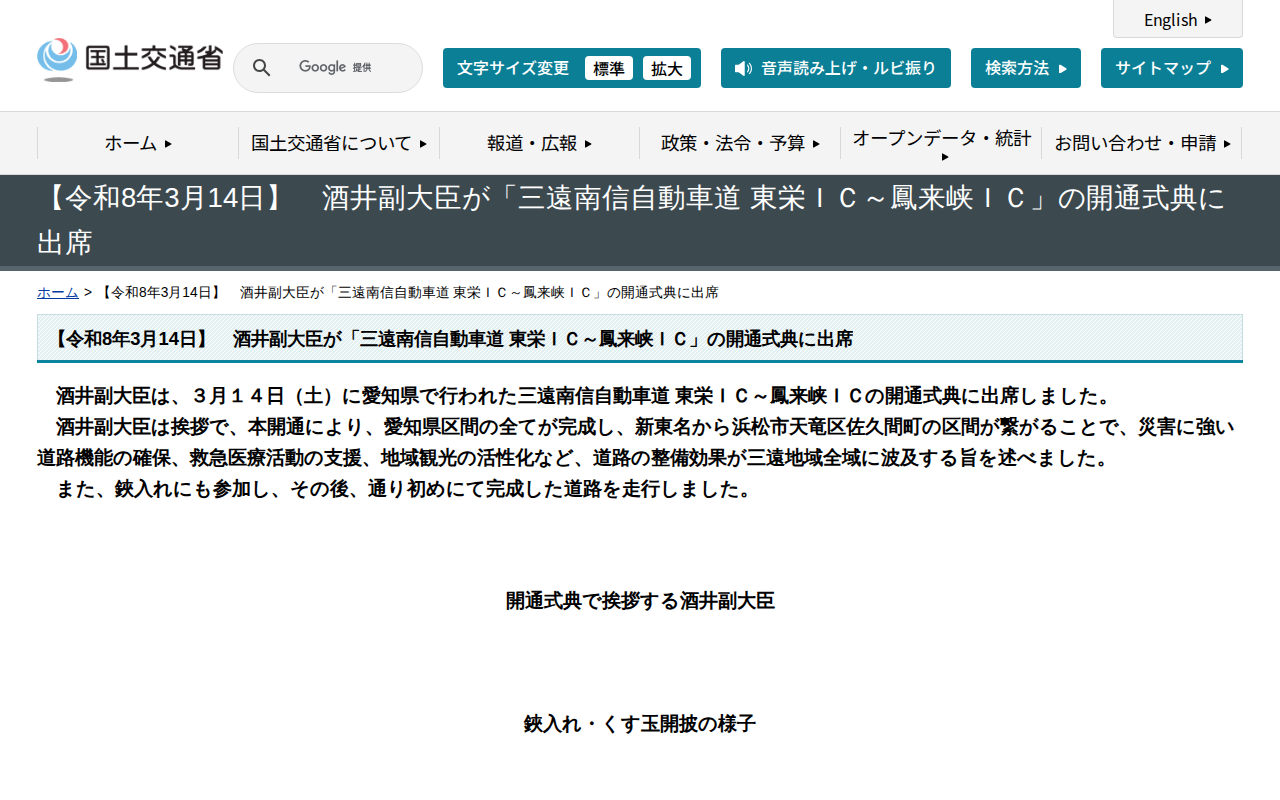 【令和8年3月14日】 酒井副大臣が「三遠南信自動車道 東栄IC~鳳来峡IC」の開通式典に出席 - 国土交通省