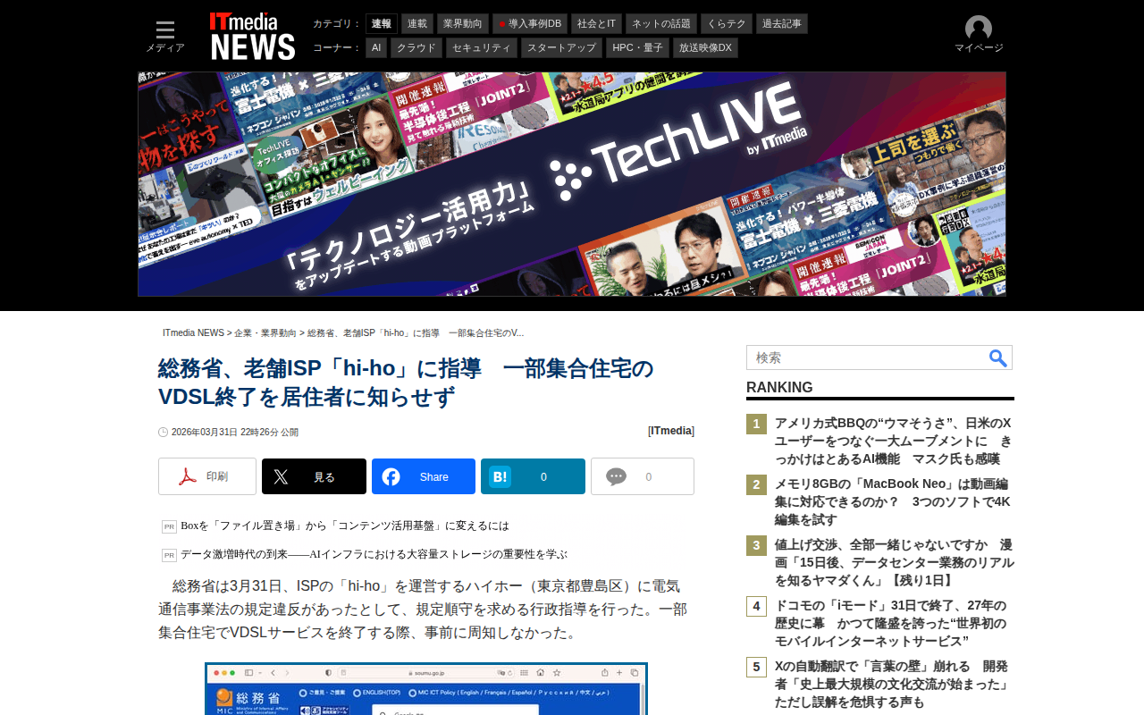 総務省、老舗ISP「hi-ho」に指導 一部集合住宅のVDSL終了を居住者に知らせず - ITmedia NEWS