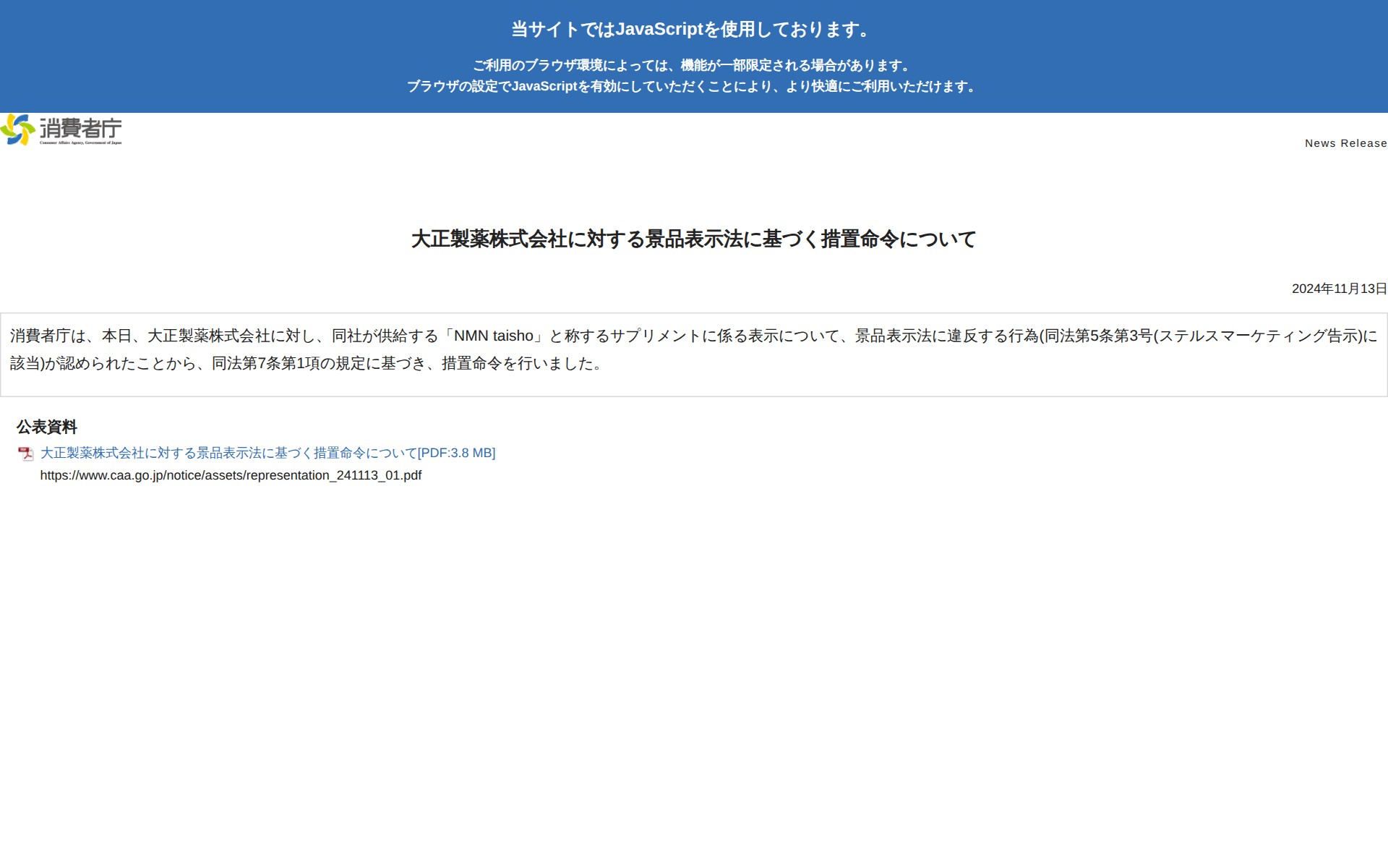 このページは、消費者庁が2024年11月13日に大正製薬株式会社に対して行った措置命令について公表しています。同社が供給する「NMN taisho」というサプリメントの表示が景品表示法に違反していたことが認められたため、同法第7条第1項に基づき措置命令が実施されました。違反内容は景品表示法第5条第3号のステルスマーケティング告示に該当するものです。詳細な情報は公表資料のPDFで確認できます。