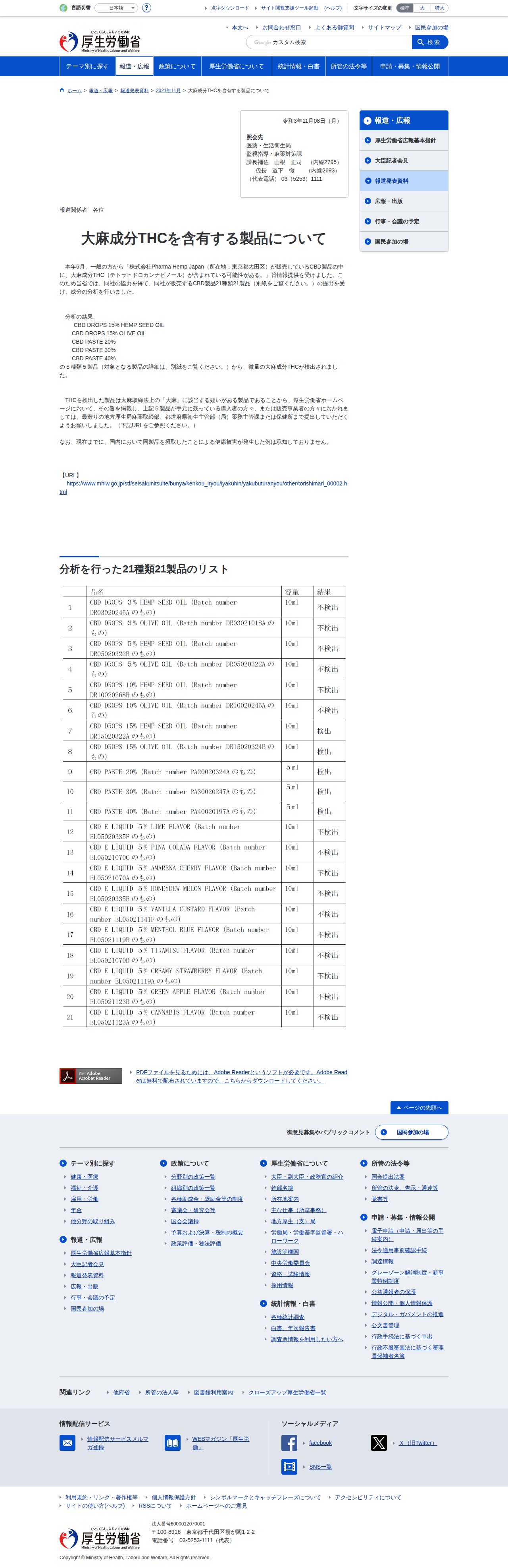 このページは、厚生労働省が2021年11月8日に発表した報道資料です。株式会社Pharma Hemp Japanが販売するCBD製品21種類のうち、5製品(CBD DROPS 15%とCBD PASTEの複数製品)から微量の大麻成分THCが検出されたことを報告しています。これらの製品は大麻取締法上の「大麻」に該当する疑いがあるため、購入者や販売事業者に対して最寄りの麻薬取締部や保健所への提出を呼びかけています。現在までに健康被害は報告されていません。