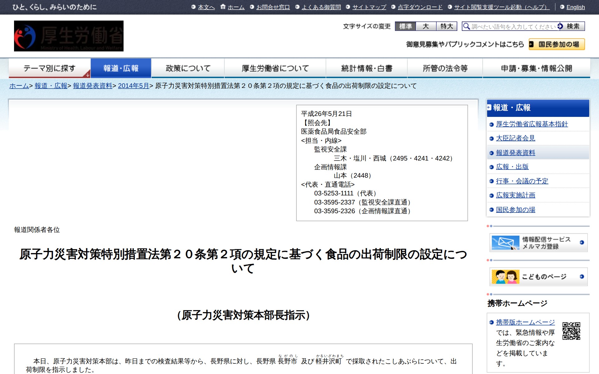 原子力災害対策特別措置法第20条第2項の規定に基づく食品の出荷制限の設定について |報道発表資料|厚生労働省