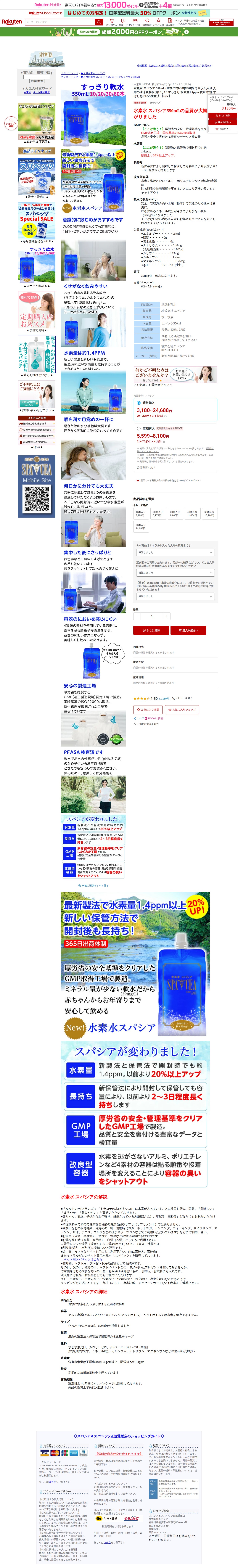 【楽天市場】水素水 スパシア 550mL (10本/20本/30本/60本) ミネラル入り 人用の清涼飲料水 おいしい すっきり 水素量1.4ppm 軟水 中性 すぱしあ PFAS検査済 【sspc】:横浜元町 Water Store SPACEA - 保存されたスクリーンショット