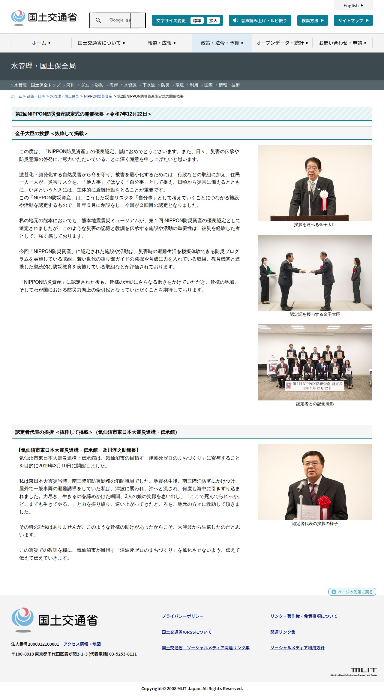 このページは、令和7年12月22日に開催された第2回NIPPON防災資産認定式の概要を紹介しています。金子大臣は、激甚化・頻発化する自然災害から命を守るため、住民が災害リスクを「自分事」として捉え、日頃から備えることの重要性を強調しました。NIPPON防災資産は災害リスク認識を促進する施設・活動を認定する制度で、今回は避難生活の模擬体験、若い世代の語り部育成、教育機関との連携などが評価されています。気仙沼市東日本大震災遺構・伝承館の館長は、東日本大震災での貴重な経験から、「津波死ゼロのまちづくり」に向けた教訓伝承の継続を誓いました。