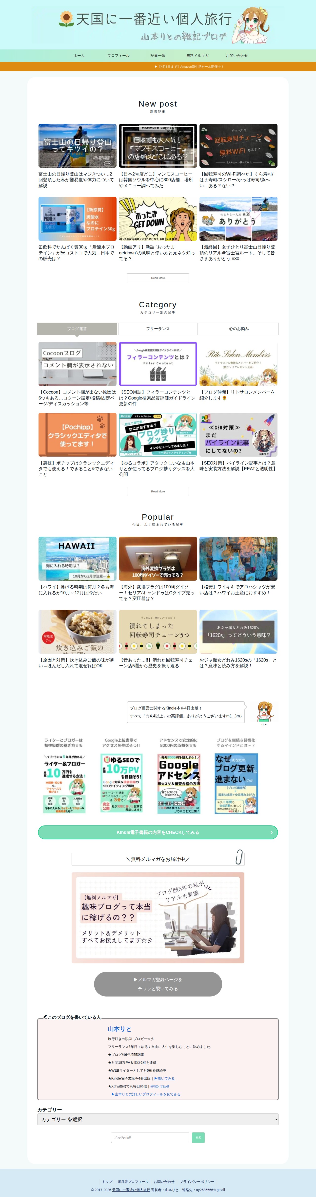 このページは、旅行好きの脱OLブロガー・山本りとが運営する個人ブログです。ブログ歴6年で月間18万PVを達成し、ブログ運営、フリーランス、心の悩み、旅行など多岐にわたるカテゴリーで655記事を公開しています。富士山登山やハワイ旅行などの旅行記、ブログ運営ノウハウ、フリーランスの仕事術、心理的な悩み解決方法などを扱っており、Kindle電子書籍4冊も出版。WEBライターとしても月6桁を継続中で、無料メルマガも配信しています。