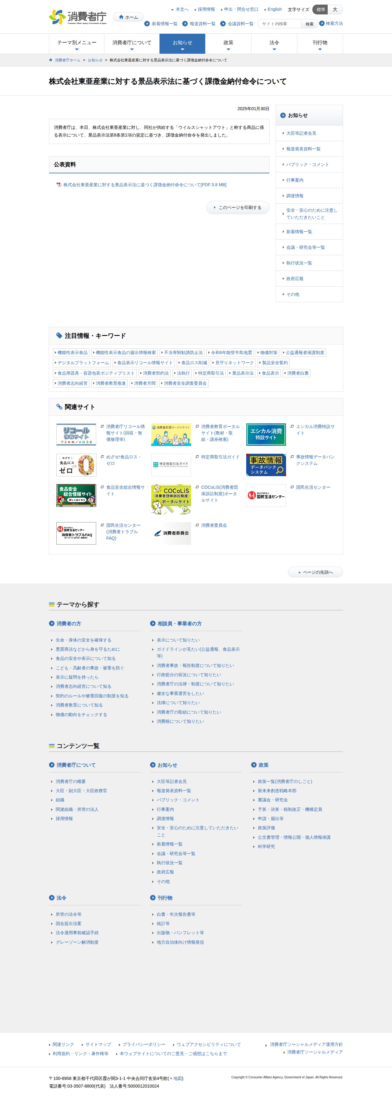 このページは、消費者庁が2025年1月30日に株式会社東亜産業に対して発出した景品表示法に基づく課徴金納付命令についての公式発表です。同社が供給する「ウイルスシャットアウト」と称する商品の表示が景品表示法第8条第1項に違反していることを理由に、課徴金納付命令が発出されました。詳細な公表資料がPDF形式で提供されています。