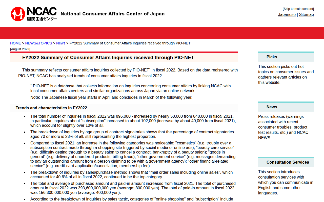 FY2022 Summary of Consumer Affairs Inquiries received through PIO-NET - National Consumer Affairs Center of JAPAN -