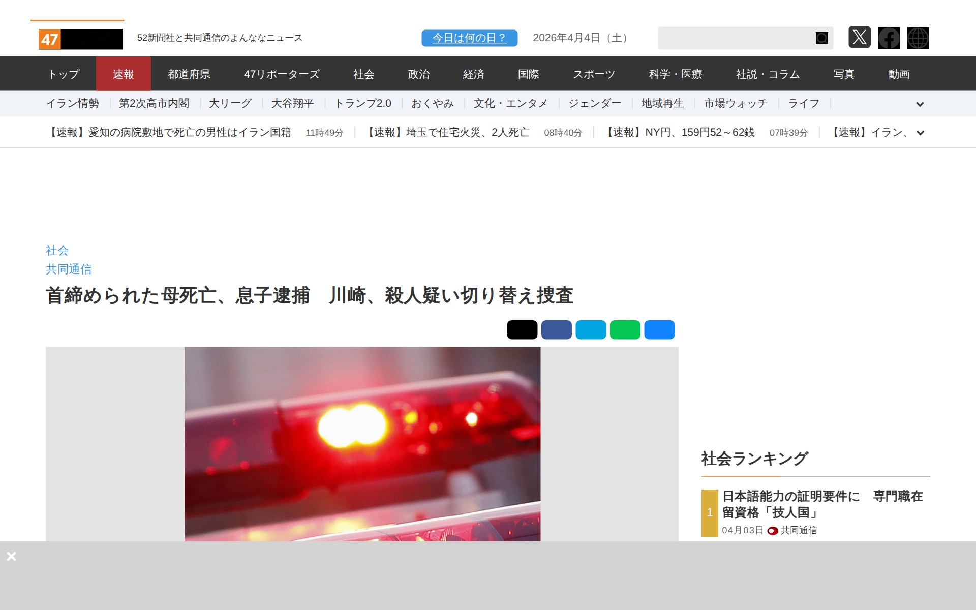 首締められた母死亡、息子逮捕 川崎、殺人疑い切り替え捜査|47NEWS(よんななニュース)