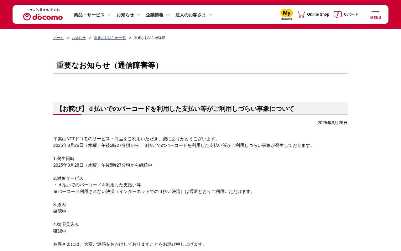 重要なお知らせ(通信障害等) : 【お詫び】d払いでのバーコードを利用した支払い等がご利用しづらい事象について | お知らせ | NTTドコモ
