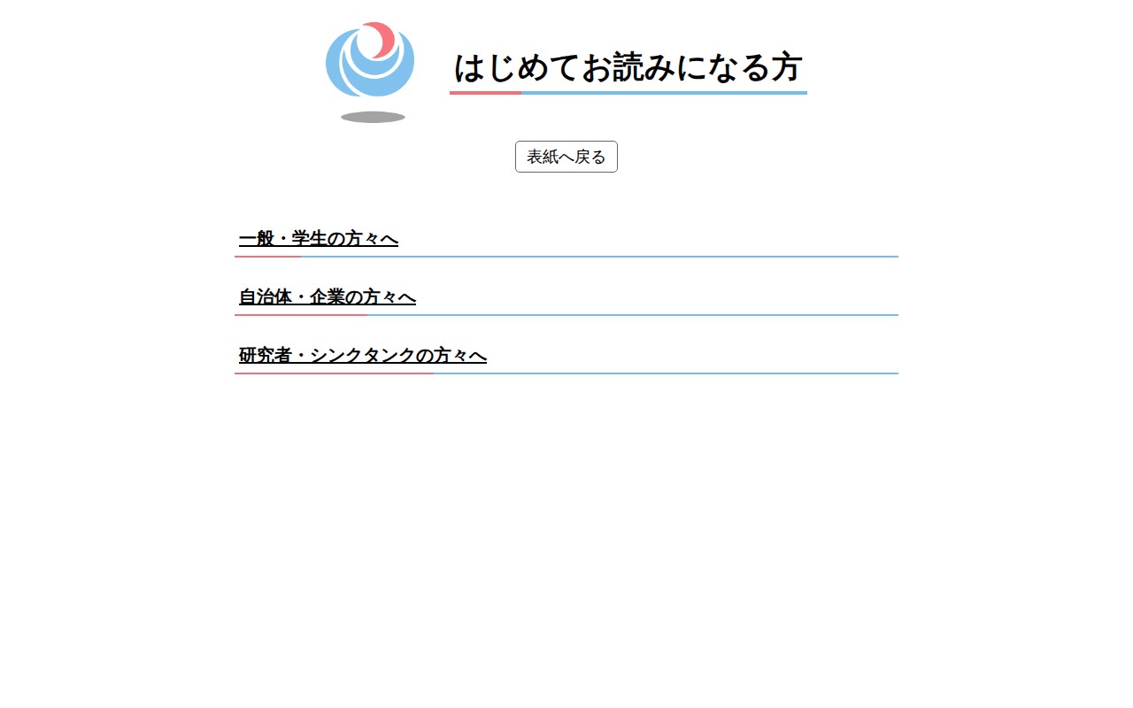 このページは、国土交通白書2025のターゲット別ナビゲーションページです。読者の属性に応じた異なるアプローチを提供しており、はじめて読む方向けの案内、一般・学生向け、自治体・企業向け、研究者・シンクタンク向けの各セクションへのリンクが用意されています。表紙への戻りオプションも含まれており、利用者が自分のニーズに合わせた最適なコンテンツにアクセスできる構成になっています。
