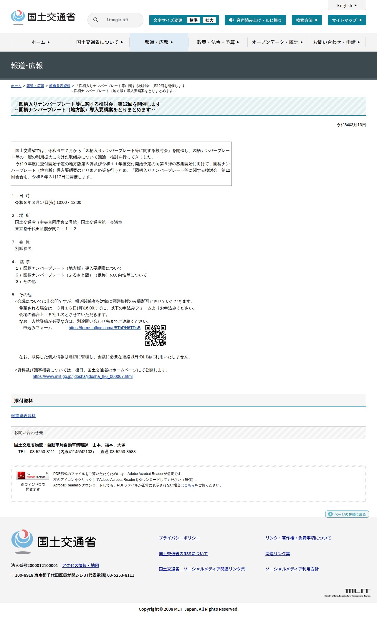 報道発表資料:「図柄入りナンバープレート等に関する検討会」第12回を開催します<br>~図柄ナンバープレート(地方版)導入要綱案をとりまとめます~ - 国土交通省 - 保存されたスクリーンショット