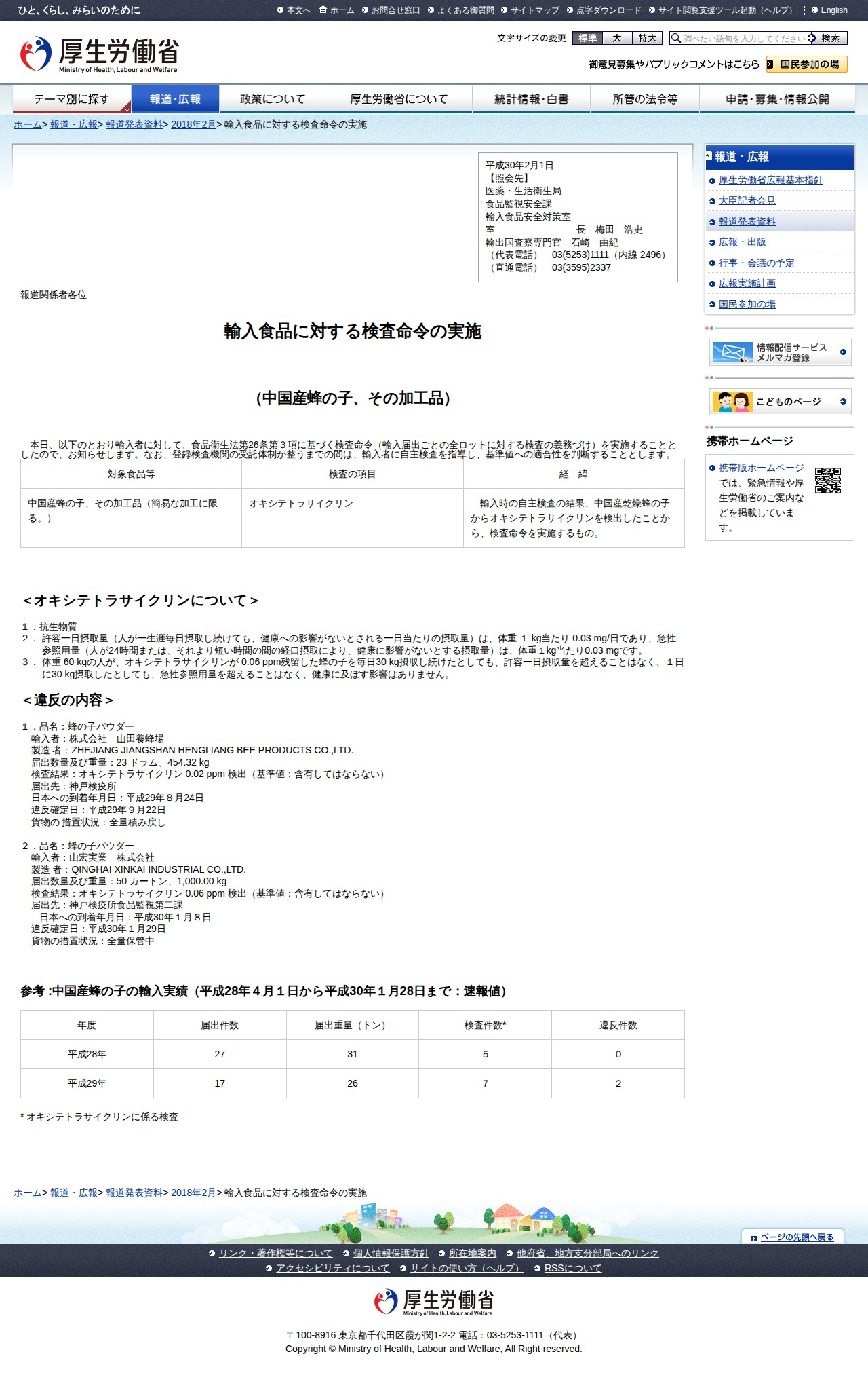 このページは、厚生労働省が2018年2月1日に発表した輸入食品検査命令に関する報道資料です。中国産蜂の子からオキシテトラサイクリン(抗生物質)が検出されたため、食品衛生法に基づいて全ロット検査を義務づけることを発表しています。違反事例として、株式会社山田養蜂場と山宏実業株式会社の製品から基準値を超える同物質が検出されました。健康への影響について、許容一日摂取量の分析結果も示されており、通常の摂取量では健康リスクはないとしています。