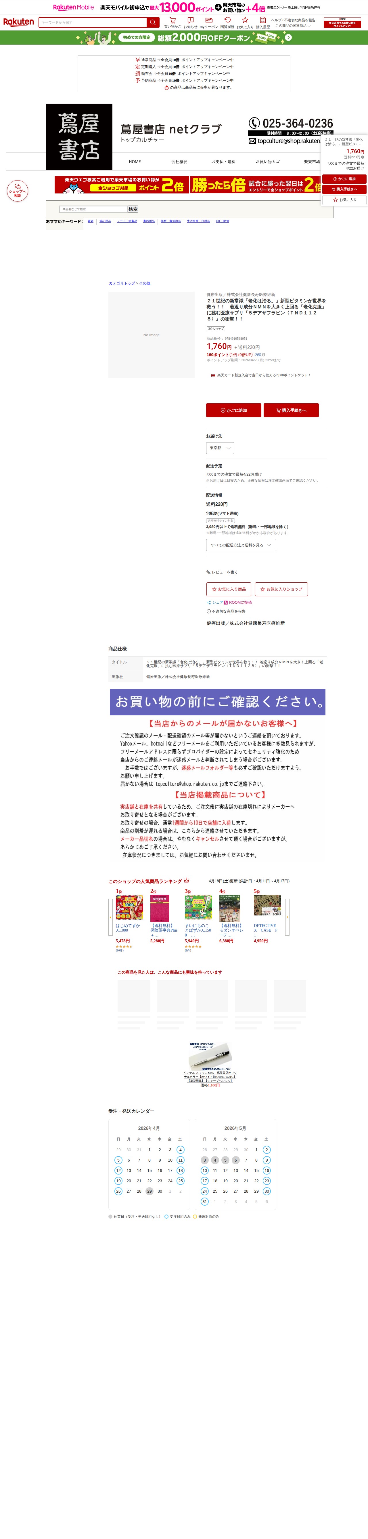 このページは、楽天市場で販売されている書籍の商品ページです。タイトルは「21世紀の新常識『老化は治る。』新型ビタミンが世界を救う!!」で、NMNを上回る老化克服成分「5デアザフラビン(TND1128)」について紹介する医療サプリメント関連の本です。出版社は健療出版/株式会社健康長寿医療維新。価格は1,760円で、送料220円、ポイント10倍キャンペーン中です。最短4月22日の配送に対応しており、3,980円以上で送料無料となります。