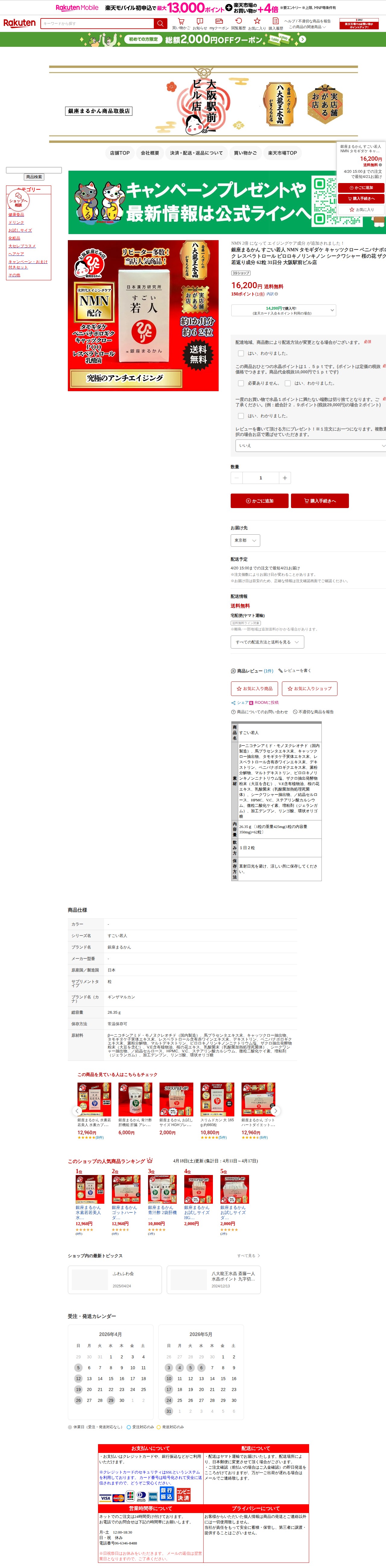 【楽天市場】銀座まるかん すごい若人 NMN タモギダケ キャッツクロー ベニバナボロギク レスベラトロール ピロロキノリンキノン シークワシャー 桜の花 ザクロ 若返り成分 62粒 31日分 大阪駅前ビル店:まるかんのお店大阪駅前ビル店 - 保存されたスクリーンショット