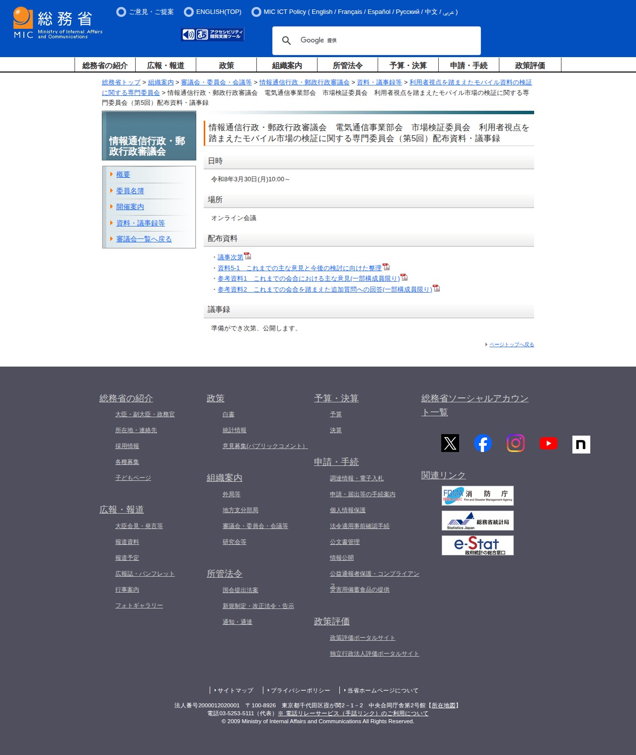 このページは、総務省の情報通信行政・郵政行政審議会電気通信事業部会市場検証委員会が開催する「利用者視点を踏まえたモバイル市場の検証に関する専門委員会」の第5回会合に関する情報を掲載しています。令和8年3月30日(月)10時からオンライン会議で開催予定で、議事次第、これまでの主な意見の整理、追加質問への回答などの配布資料が公開されています。議事録は準備完了後に公開予定です。