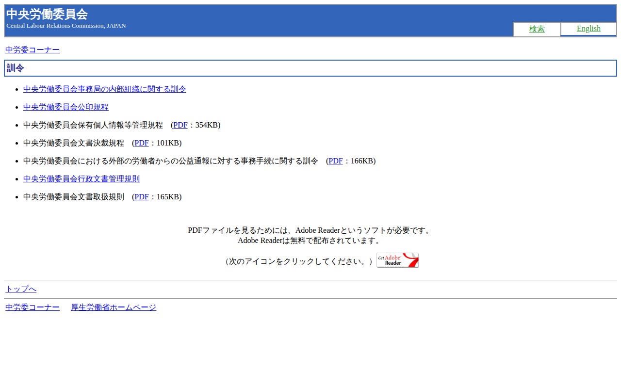 このページは、中央労働委員会の訓令に関する公式情報をまとめたものである。中央労働委員会事務局の内部組織、公印規程、個人情報管理規程、文書決裁規程、公益通報手続、行政文書管理規則、文書取扱規則など、委員会の運営に関わる各種規程・規則が掲載されている。PDFファイル形式で提供されており、閲覧にはAdobe Readerが必要である。