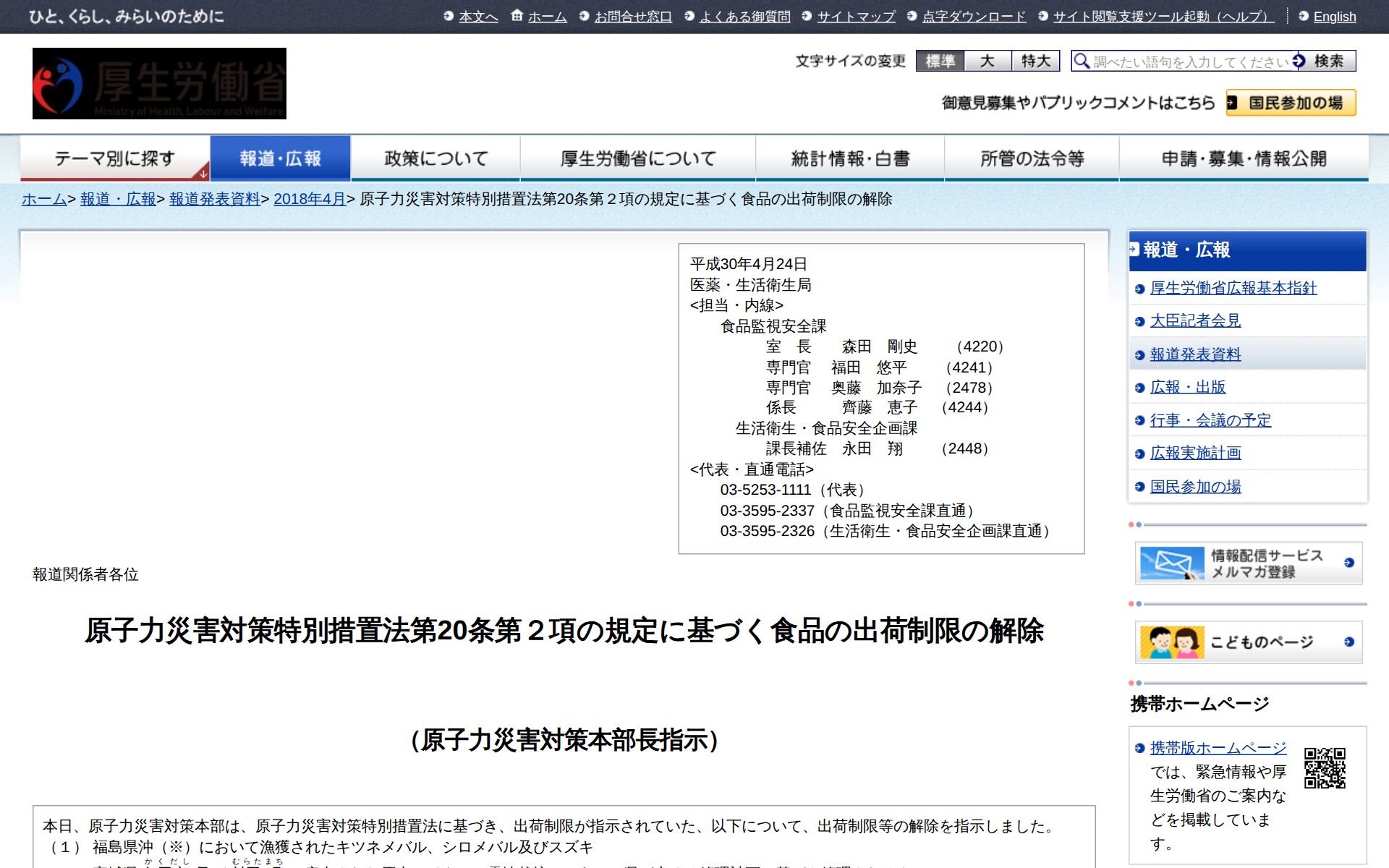 原子力災害対策特別措置法第20条第2項の規定に基づく食品の出荷制限の解除 |報道発表資料|厚生労働省