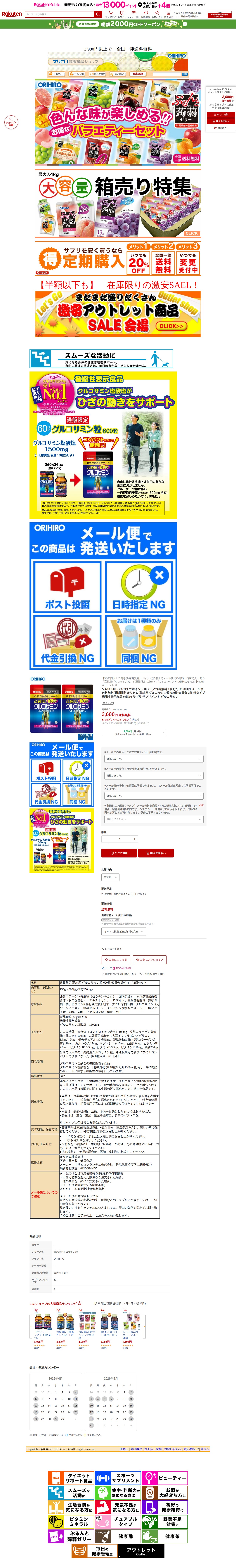 このページは、楽天市場で販売されるオリヒロの高純度グルコサミン粒のセール商品です。2個セット(600粒、60日分)が1個あたり1,800円で販売されており、4月18日はポイント10倍キャンペーン中です。メール便送料無料で、グルコサミン塩酸塩1500mg配合の機能性表示食品です。膝の動きをサポートし、膝の違和感軽減を謳っています。通販限定の袋タイプで、コンパクトで便利な商品設計となっています。