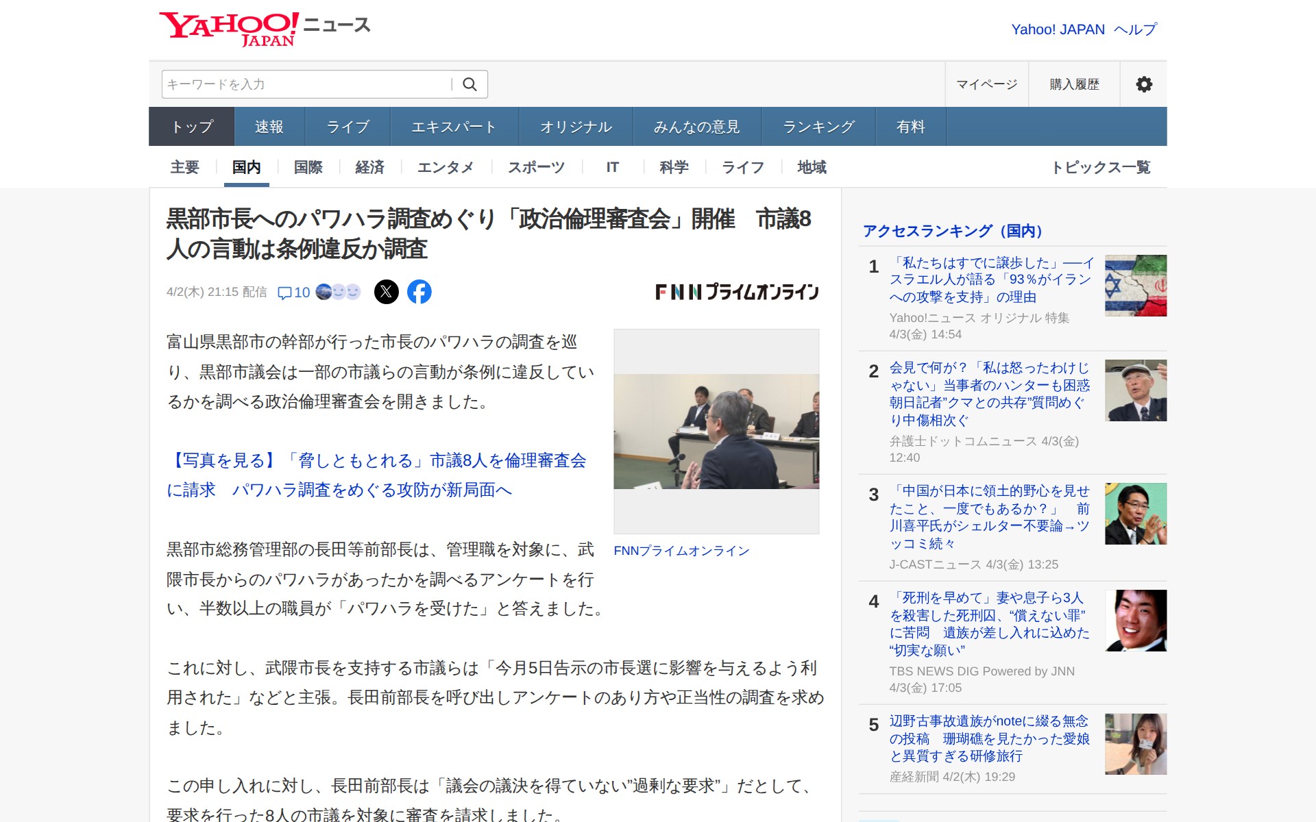 黒部市長へのパワハラ調査めぐり「政治倫理審査会」開催 市議8人の言動は条例違反か調査(FNNプライムオンライン) - Yahoo!ニュース - 保存されたスクリーンショット