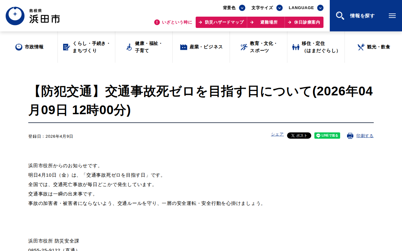 【防犯交通】交通事故死ゼロを目指す日について(2026年04月09日 12時00分)|浜田市