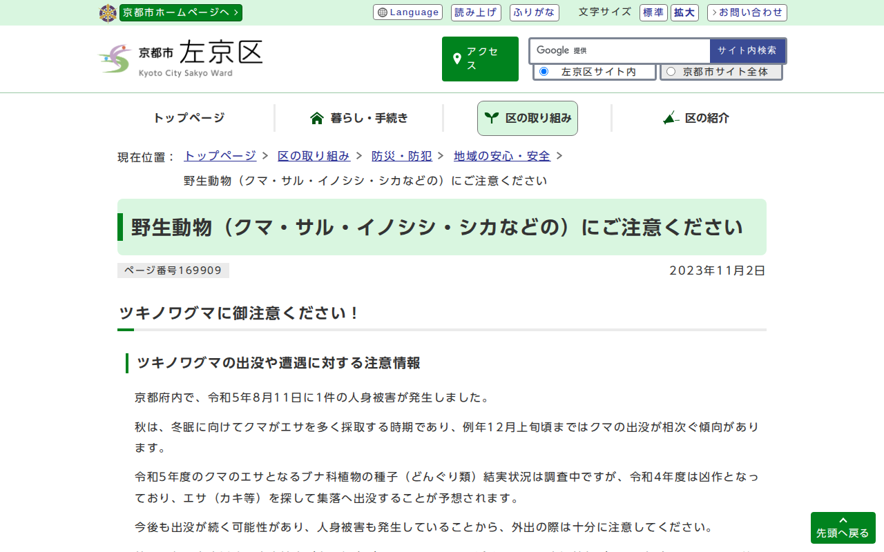 京都市左京区役所:野生動物(クマ・サル・イノシシ・シカなどの)にご注意ください - 保存されたスクリーンショット