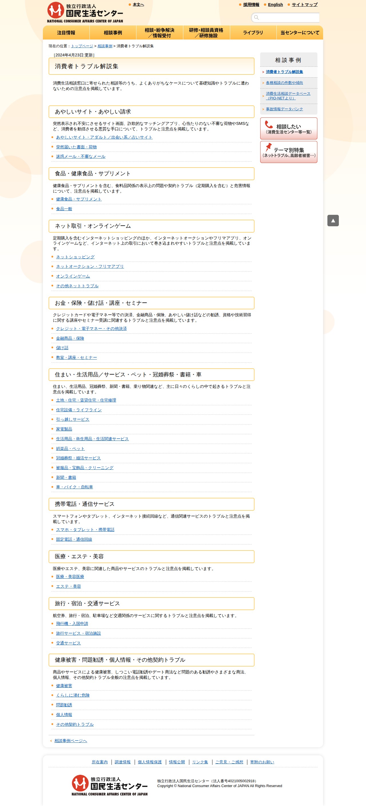このページは、国民生活センターが消費生活相談窓口に寄せられた相談事例をもとに、よくあるトラブルの基礎知識と注意点をまとめた解説集です。詐欺的なサイトや不審なメール、健康食品の定期購入、ネットショッピング、金融商品、住宅修理、通信サービス、医療・エステ、旅行サービスなど、日常生活のあらゆる場面での消費者トラブルをカテゴリー別に掲載しています。個人情報流出やしつこい勧誘といった問題についても解説し、トラブルに遭わないための対策情報を提供しています。