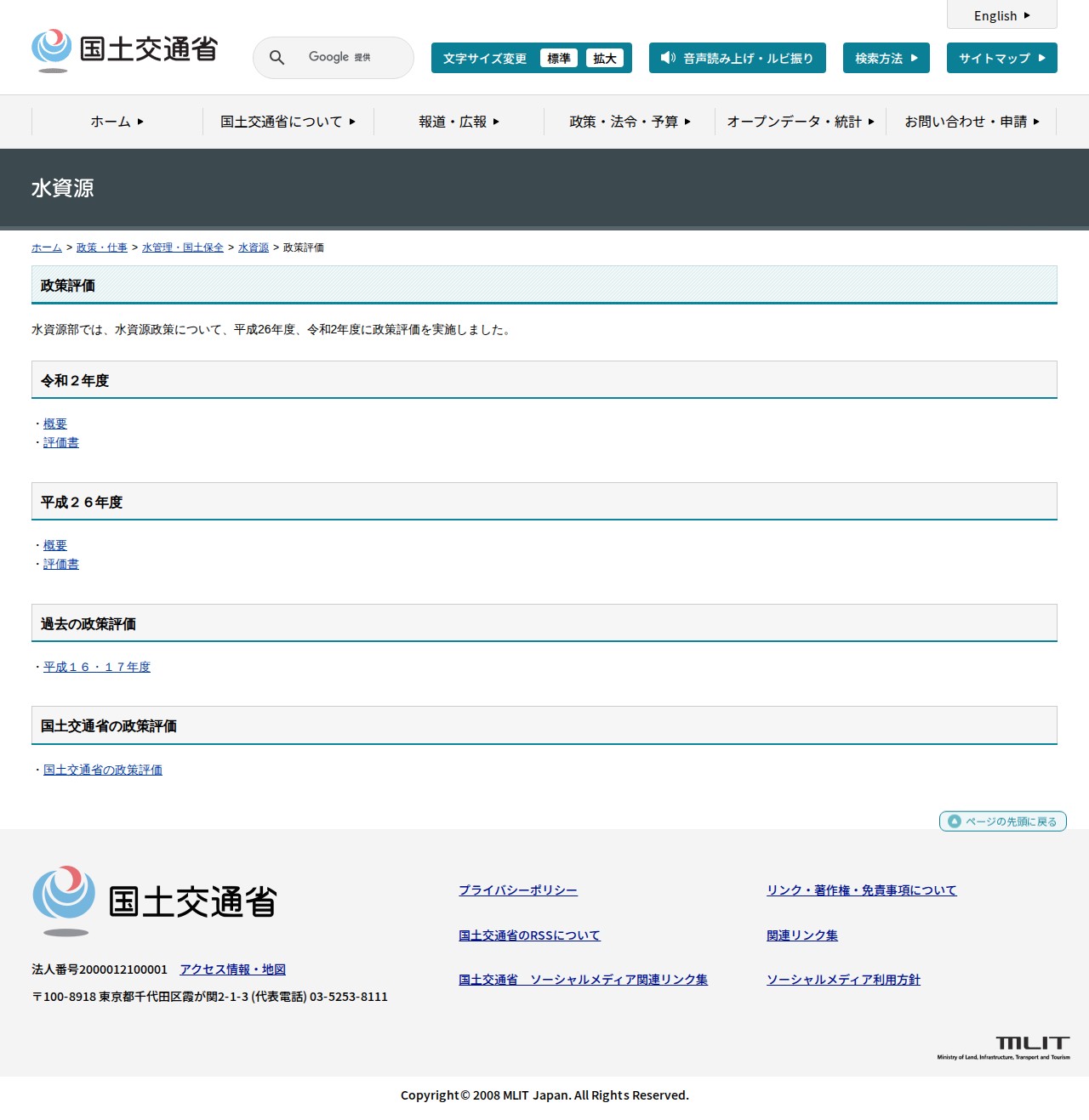 このページは、国土交通省水資源部が実施した水資源政策の政策評価に関する情報を提供しています。令和2年度と平成26年度の政策評価について、概要と評価書が掲載されており、過去の平成16・17年度の評価も参照可能です。国土交通省全体の政策評価情報へのリンクも含まれています。