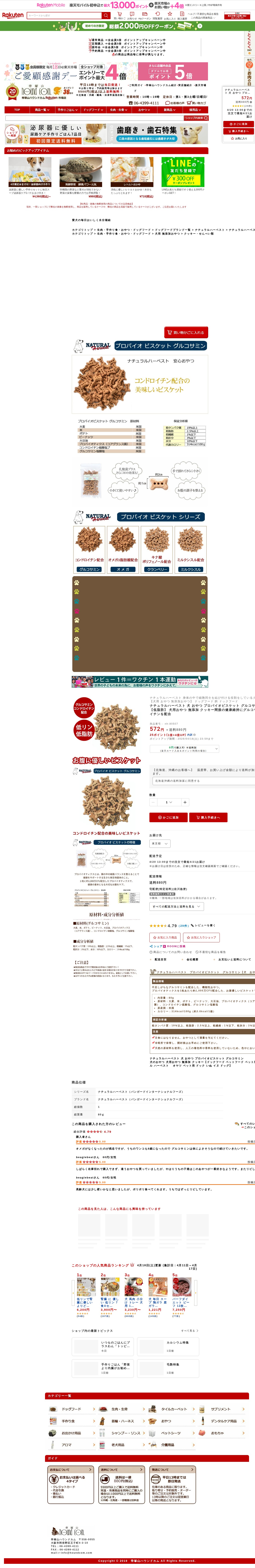 このページは、楽天市場で販売されているナチュラルハーベスト製の犬用おやつ「プロバイオビスケット グルコサミン」の商品紹介ページです。低リン・低脂肪の無添加クッキーで、関節の健康維持に役立つグルコサミンとコンドロイチンを配合しています。1粒あたり約1,000万CFUのプロバイオティクスを含み、お腹に優しい設計です。内容量80g、価格572円(送料880円)で、平日13時までの注文で当日発送対応。29件のレビューがあり、高評価を得ています。