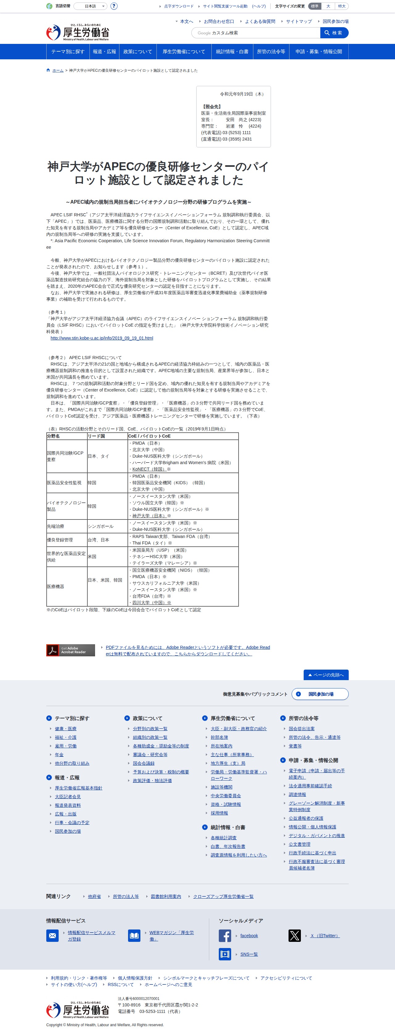 このページは、神戸大学がAPEC(アジア太平洋経済協力)のライフサイエンスイノベーションフォーラム規制調和執行委員会におけるバイオテクノロジー製品分野の優良研修センター(CoE)のパイロット施設に認定されたことを発表しています。神戸大学は、関連組織の協力の下、海外規制当局を対象とした研修をパイロットプログラムとして実施し、2020年のAPEC会合での正式認定を目指します。研修は厚生労働省の補助金で実施されます。