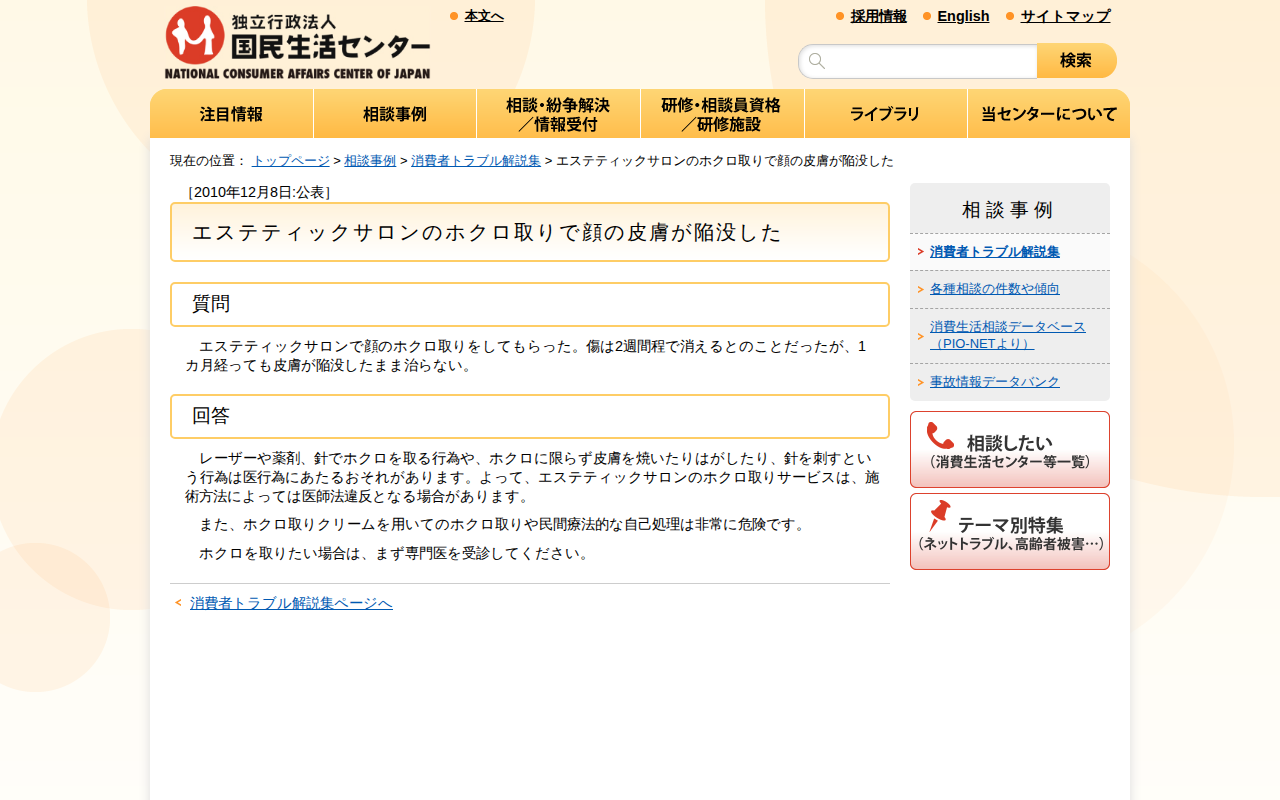 エステティックサロンのホクロ取りで顔の皮膚が陥没した(消費者トラブル解説集)_国民生活センター - 保存されたスクリーンショット