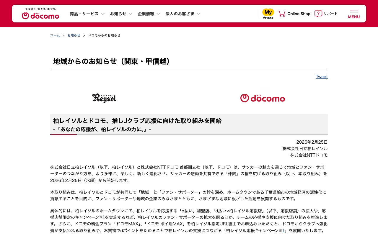 地域からのお知らせ:柏レイソルとドコモ、推しJクラブ応援に向けた取り組みを開始 -「あなたの応援が、柏レイソルの力に。」- | お知らせ | NTTドコモ - 保存されたスクリーンショット