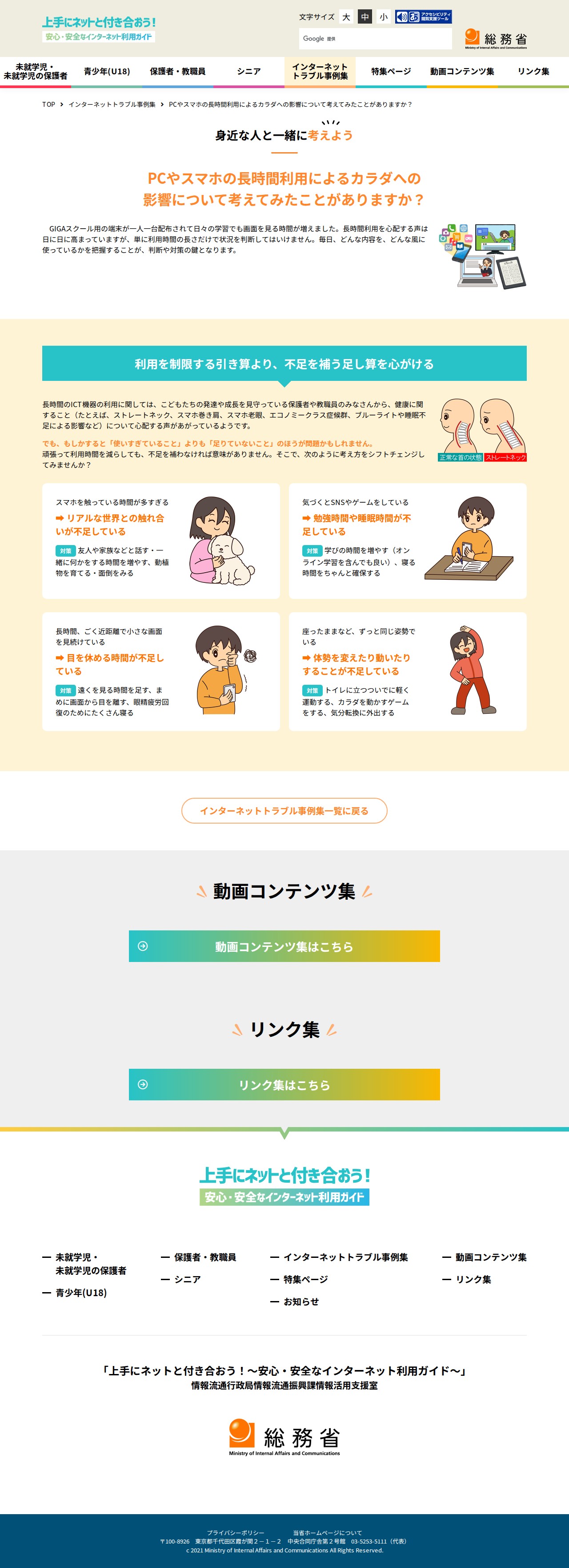 【身近な人と一緒に考えよう】PCやスマホの長時間利用によるカラダへの影響について考えてみたことがありますか? | インターネットトラブル事例集 | 上手にネットと付き合おう! ~安心・安全なインターネット利用ガイド~ | 総務省 - 保存されたスクリーンショット