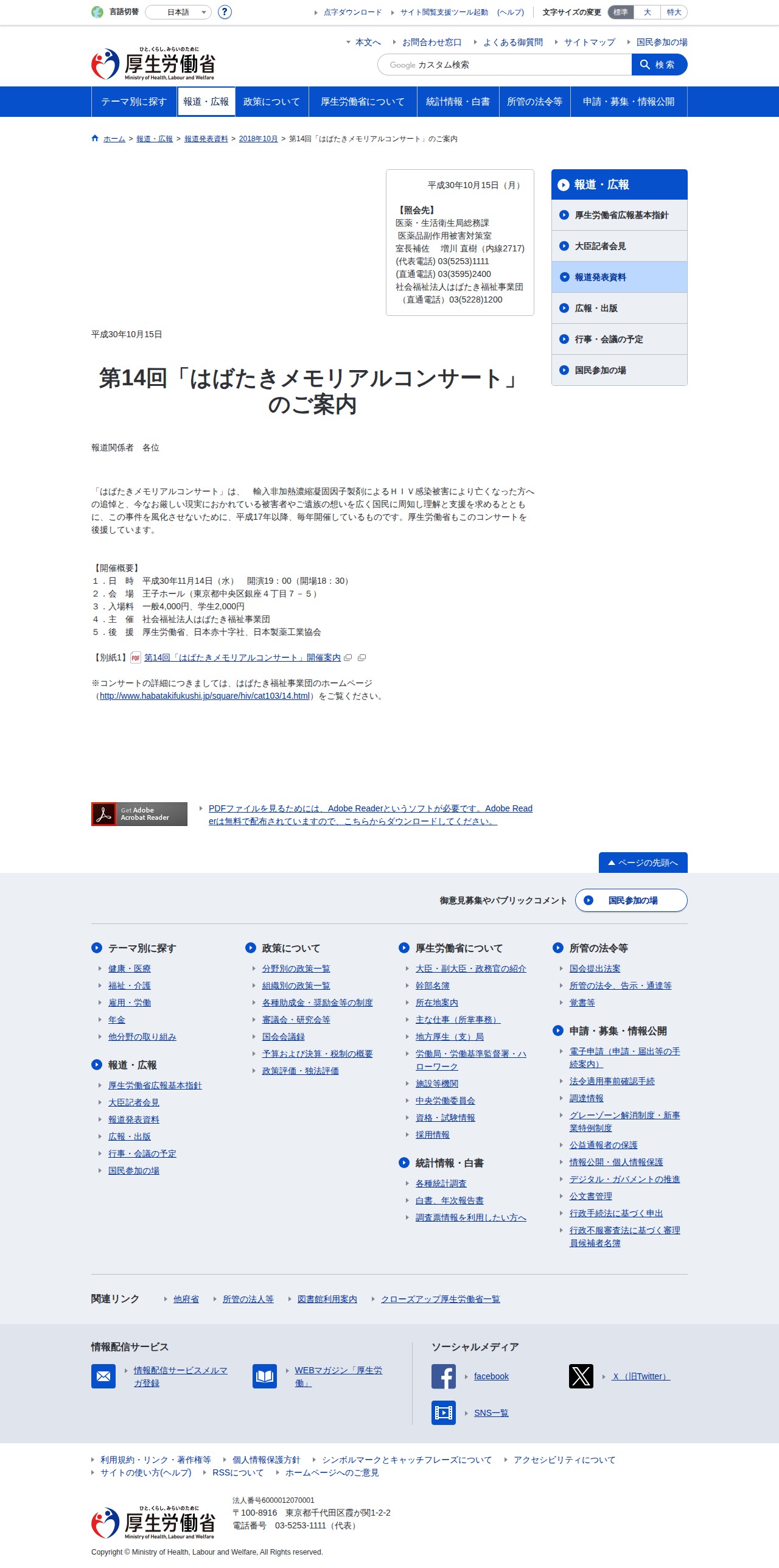 このページは、第14回「はばたきメモリアルコンサート」の開催についての案内を提供しています。このコンサートは、HIV感染被害による亡くなった方を追悼し、現在も苦しむ被害者や遺族の支援を求めるために、平成17年から毎年行われています。イベントは平成30年11月14日に王子ホールで開催され、入場料は一般4,000円、学生2,000円です。主催は社会福祉法人はばたき福祉事業団で、厚生労働省が後援しています。