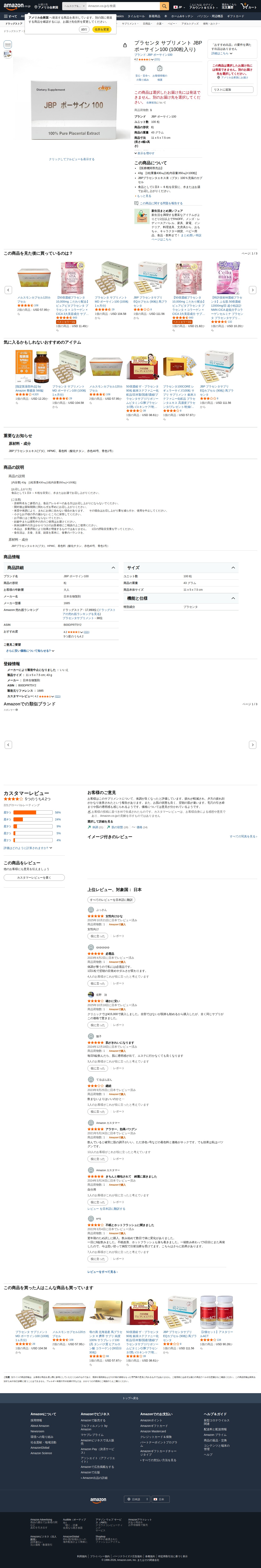 このページはAmazonで販売されているJBPポーサイン100というプラセンタサプリメント商品の紹介ページである。100粒入りで、ブタ由来のプラセンタエキス末を100%使用したカプセル形状のサプリである。1粒あたり350㎎の内容量で、1日3~6粒を目安に水またはお湯で摂取する。医療機関専売品で、大人向けの栄養補助食品である。商品重量は43グラム、評価は5つ星中4.2となっており、221件のレビューがある。