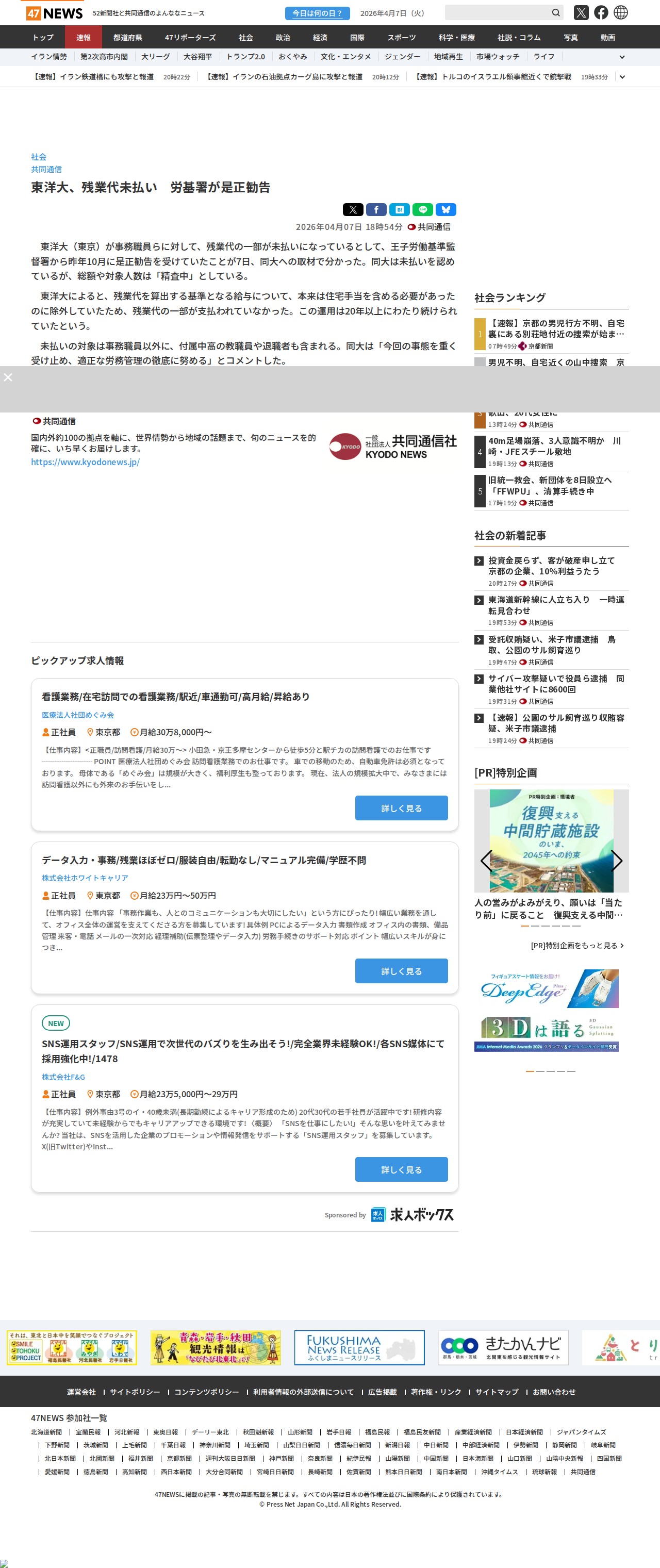 東洋大、残業代未払い 労基署が是正勧告|47NEWS(よんななニュース)