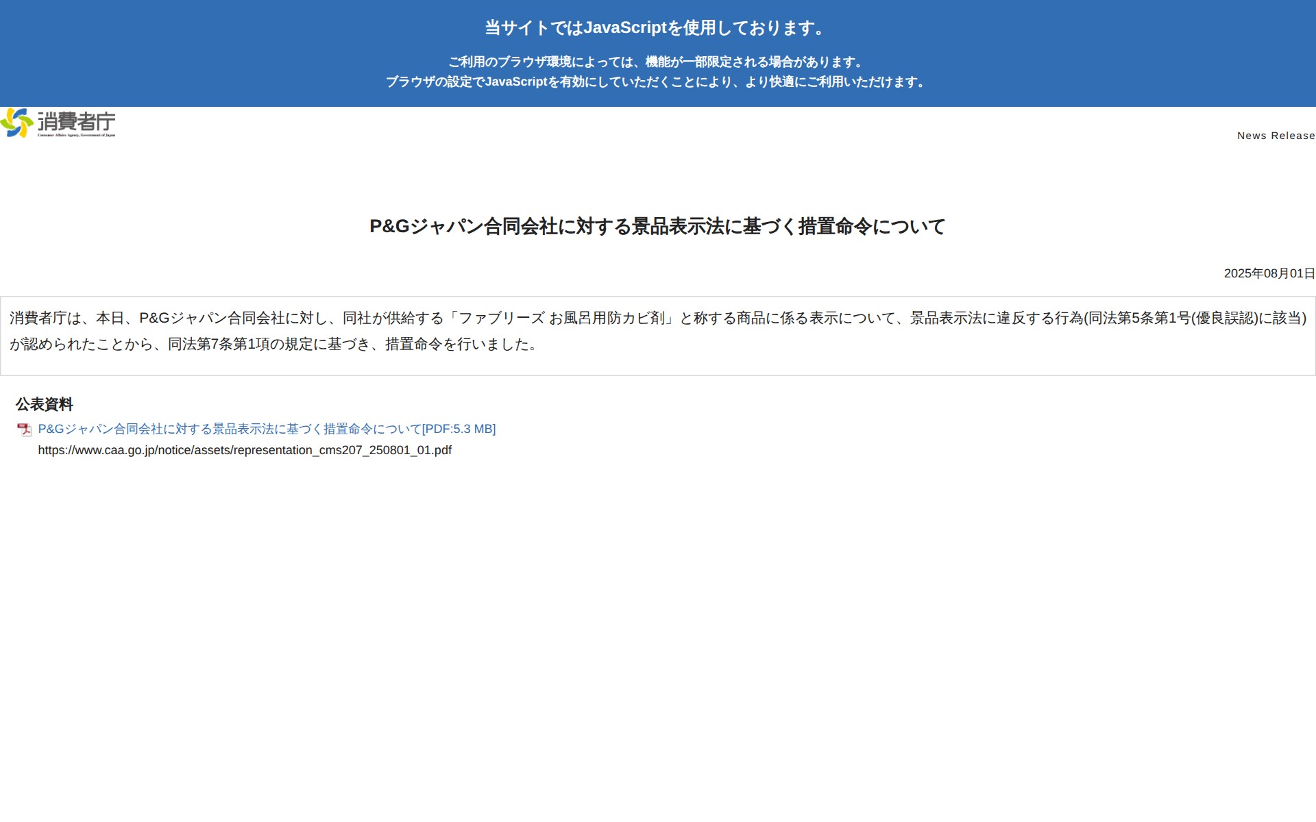 このページは、消費者庁がP&Gジャパン合同会社に対して2025年8月1日に行った景品表示法に基づく措置命令について記載しています。同社が供給する「ファブリーズ お風呂用防カビ剤」の表示が景品表示法第5条第1号の優良誤認に該当する違反行為として認定され、同法第7条第1項の規定に基づき措置命令が下されました。詳細は公表資料として5.3MBのPDFファイルで公開されています。