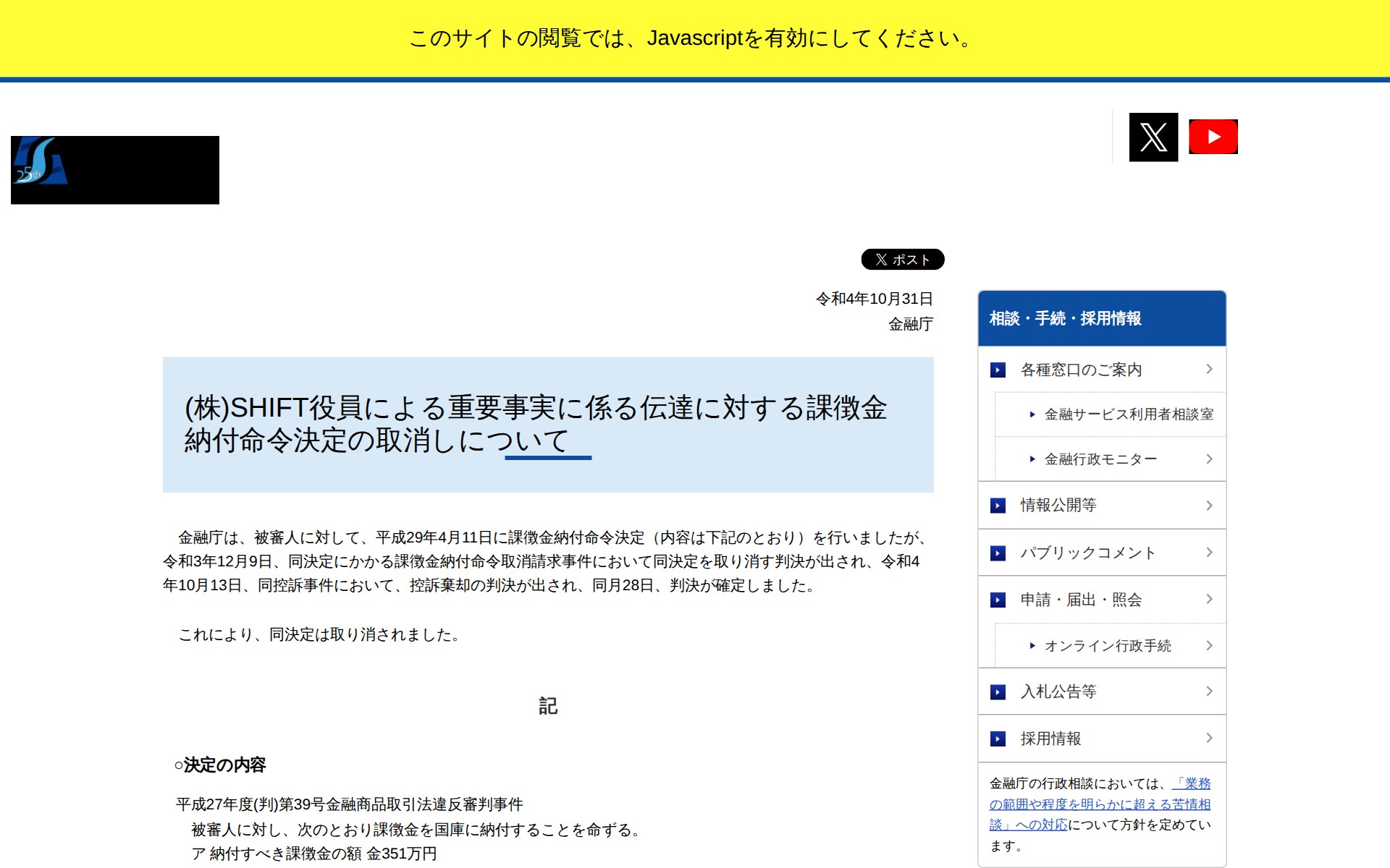 このページは、金融庁が(株)SHIFT役員に対して平成29年4月11日に下した課徴金納付命令決定(351万円)の取消しについて発表しています。令和3年12月9日の判決で同決定が取り消され、その後の控訴審でも控訴が棄却され、令和4年10月28日に判決が確定したため、課徴金納付命令決定は取り消されました。これは金融商品取引法違反に関する審判事件でした。