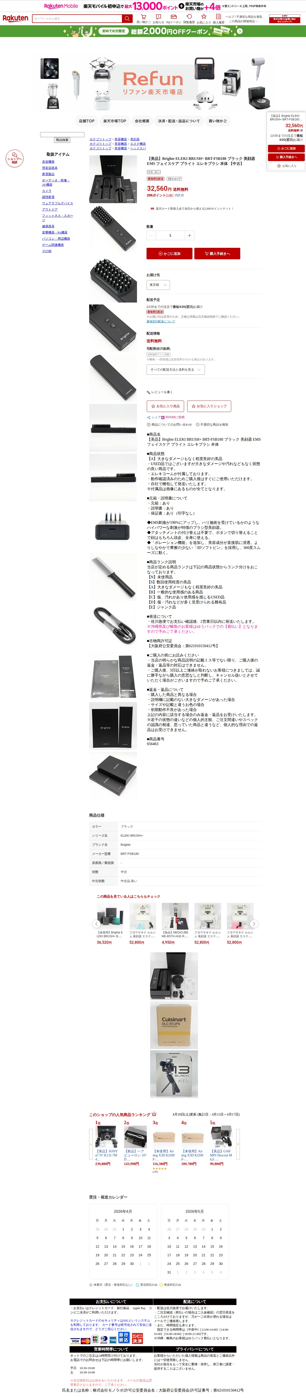 このページは、楽天市場のリファン楽天市場店で販売されている中古の美顔器「Brighte ELEKI BRUSH+ BRT-FSB180」の商品情報です。価格は32,560円で送料無料、13時までの注文で翌日配送対応です。商品状態はランクAの美品で、EMS刺激が190%アップされたブラシ型美顔器で、ボタン切り替えで顔・頭皮・全身に使用可能です。ポレーション機能搭載で美容成分の浸透性が向上し、3Dソフトピンで360度スムーズに動きます。元箱・説明書・保証書付属、動作確認済みです。