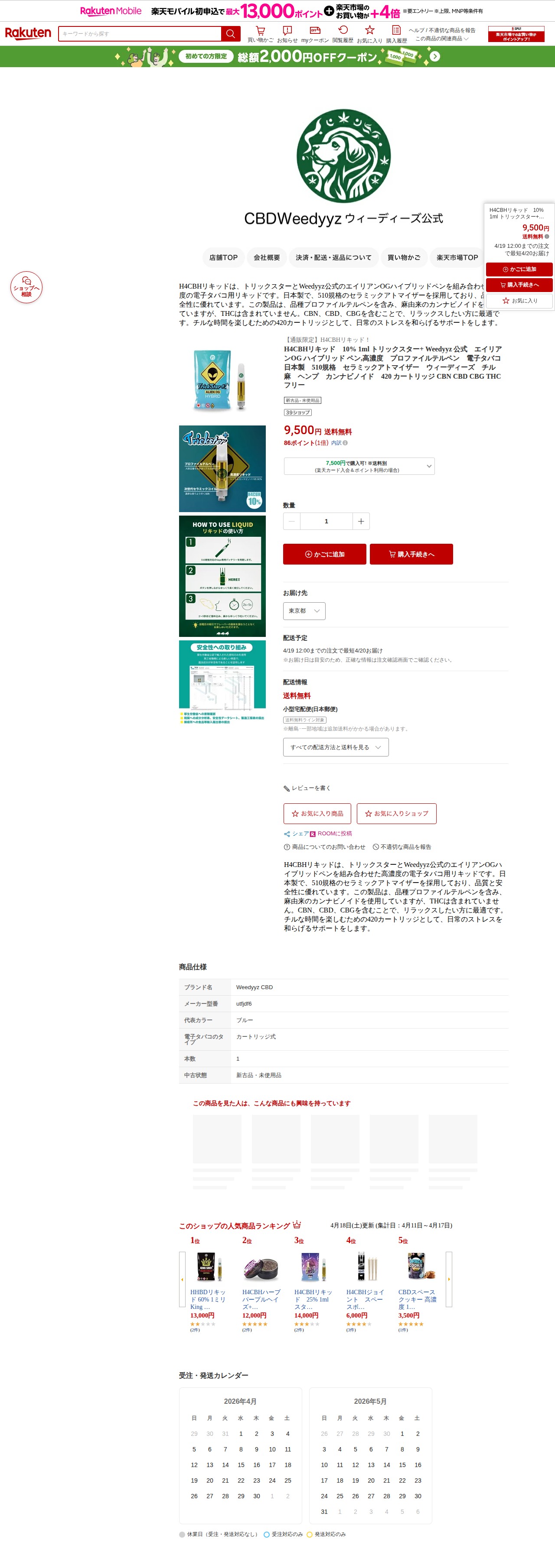 このページは、楽天市場で販売されているWeedyyz公式のH4CBHリキッド商品ページです。10%濃度の1mlカートリッジで、価格は9,500円(送料無料)。日本製で510規格のセラミックアトマイザーを採用しており、エイリアンOGハイブリッドペンとして提供されています。麻由来のCBN、CBD、CBGを含むカンナビノイド製品で、THCは含まれていません。プロファイルテルペン配合で、リラックス効果を目的とした電子タバコ用リキッドです。4月19日12:00までの注文で翌日配送対応しており、ポイント還元も受けられます。